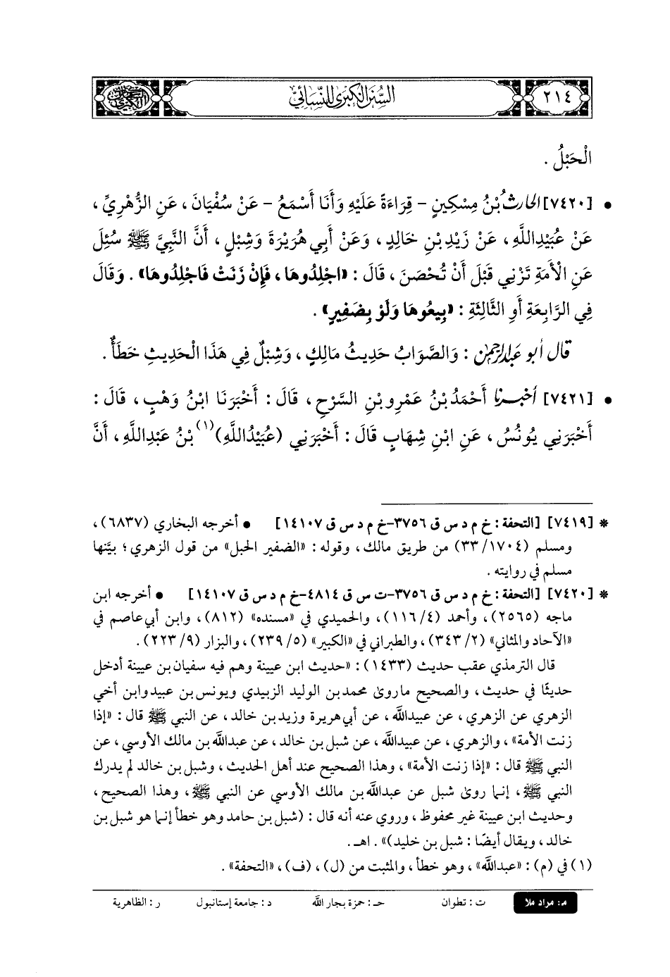 7421- أَخبَرنا أَحْمَدُ بنُ عَمْرِو بنِ السَّرْحِ، قَالَ: أَخبَرنا ابْنُ وَهْبٍ، قَالَ: أَخْبَرَنِي يُونُسُ، عَنِ ابْنِ شِهَابٍ، قَالَ: أَخْبَرَنِي عُبَيْدُ اللهِ بنُ عَبدِ اللهِ، أَنَّ شِبْلَ بْنَ حَامِدٍ (1) المُزَنِيَّ أَخْبَرَهُ؛ أَنَّ عَبدَ اللهِ بْنَ مَالِكٍ الأَوْسِيَّ أَخْبَرَهُ؛ أَنَّ رَسُولَ اللهِ صَلى الله عَلَيهِ وسَلم قَالَ: الوَلِيدَةُ إِنْ زَنَتْ فَاجْلِدُوهَا، ثُمَّ إِنْ زَنَتْ فَاجْلِدُوهَا، ثُمَّ إِنْ زَنَتْ فَاجْلِدُوهَا، ثُمَّ بِيعُوهَا وَلَوْ بِضَفِيرٍ. وَالضَّفِيرُ: الحَبْلُ، فِي الثَّالِثَةِ أَوِ الرَّابِعَةِ.