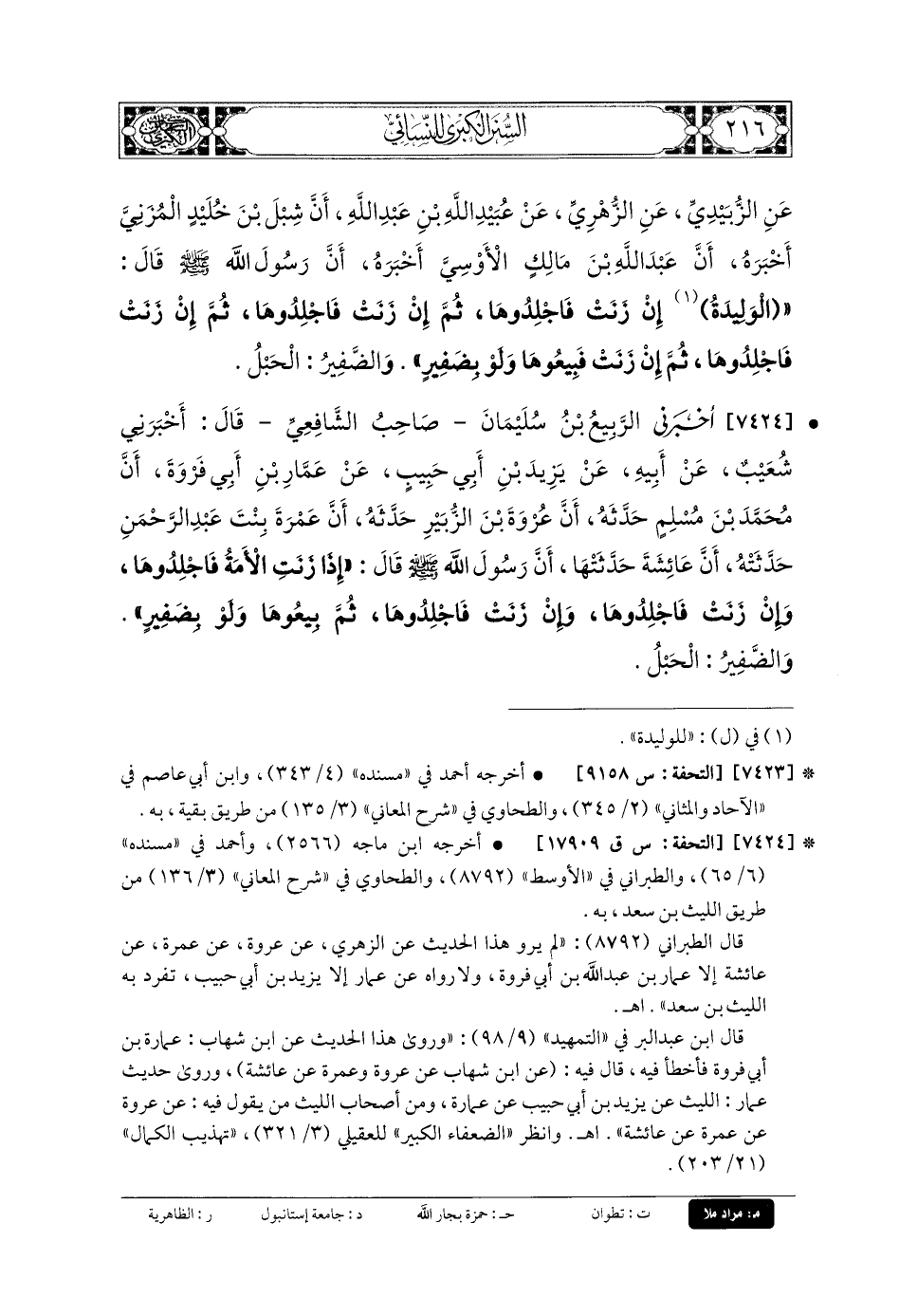 7424- أَخْبَرَنِي الرَّبِيعُ بنُ سُلَيْمَانَ صَاحِبُ الشَّافِعِيِّ، قَالَ: أَخْبَرَنِي شُعَيْبٌ، عَن أَبيهِ، عَن يَزِيدَ بنِ أَبي حَبِيبٍ، عَن عَمَّارِ بنِ أَبي فَرْوَةَ، أَنَّ مُحَمدَ بْنَ مُسْلِمٍ حَدَّثَهُ، أَنَّ عُرْوَةَ بْنَ الزُّبَيْرِ حَدَّثَهُ، أَنَّ عَمْرَةَ بِنْتَ عَبدِ الرَّحمَنِ حَدَّثَتْهُ، أَنَّ عَائِشَةَ حَدَّثَتْهَا، أَنَّ رَسُولَ اللهِ صَلى الله عَلَيهِ وسَلم قَالَ: إِذَا زَنَتِ الأَمَةُ فَاجْلِدُوهَا، وَإِنْ زَنَتْ فَاجْلِدُوهَا، وَإِنْ زَنَتْ فَاجْلِدُوهَا، ثُمَّ بِيعُوهَا وَلَوْ بِضَفِيرٍ، وَالضَّفِيرُ: الحَبْلُ.
