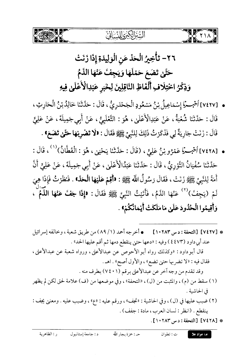 7428- أَخبَرنا عَمْرُو بنُ عَليٍّ، قَالَ: حَدَّثنا يَحْيَى، هو القطان، قَالَ: حَدَّثنا سُفيانُ الثَّوْرِيُّ، قَالَ: حَدَّثنا عَبدُ الأَعْلَى، عَن أَبي جَمِيلَةَ، عَن عَليٍّ، أَنَّ أَمَةً لِلنَّبِيِّ صَلى الله عَلَيهِ وسَلم زَنَتْ، فَقَالَ رَسُولُ اللهِ صَلى الله عَلَيهِ وسَلم: أَقِمْ عَلَيْهَا الحَدَّ، فَنَظَرْتُ فَإِذَا هِيَ لَمْ يَجِفَّ عَنهَا الدَّمُ، فَأَتَيْتُ النَّبيَّ صَلى الله عَلَيهِ وسَلم فَقَالَ: إِذَا جَفَّ عَنهَا الدَّمُ، وَأَقِيمُوا الحُدُودَ عَلَى مَا مَلَكَتْ أَيْمَانُكُمْ.