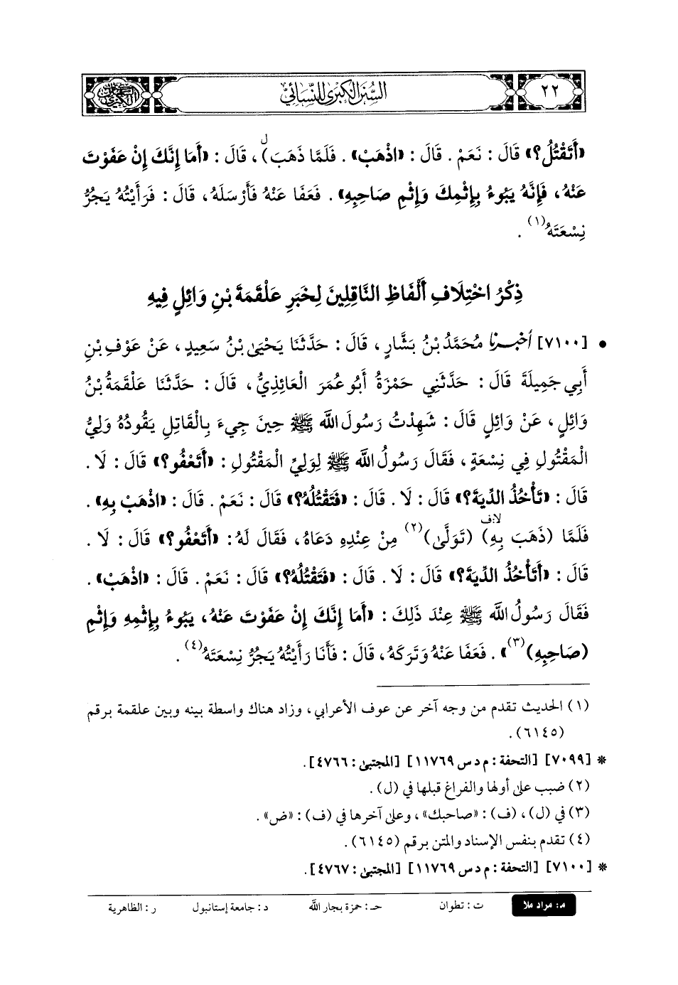 7100- أَخبَرنا مُحَمدُ بنُ بَشَّارٍ، قَالَ: حَدَّثنا يَحْيَى بنُ سَعِيدٍ، عَن عَوْفِ بنِ أَبي جَمِيلَةَ، قَالَ: حَدَّثني حَمْزَةُ أَبو عُمَرَ العَائِذِيُّ، قَالَ: حَدَّثنا عَلْقَمَةُ بنُ وَائِلٍ، عَن وَائِلٍ، قَالَ: شَهِدْتُ رَسُولَ اللهِ صَلى الله عَلَيهِ وسَلم حِينَ جِيءَ بِالقَاتِلِ، يَقُودُهُ وَلِيُّ المَقْتُولِ فِي نِسْعَةٍ، فَقَالَ رَسُولُ اللهِ صَلى الله عَلَيهِ وسَلم لِوَلِيِّ المَقْتُولِ: أَتَعْفُو؟ قَالَ: لا، قَالَ: تَأْخُذُ الدِّيَةَ؟ قَالَ: لا، قَالَ: فَتَقْتُلُهُ؟ قَالَ: نَعَمْ، قَالَ: اذْهَبْ بِهِ، فَلَمَّا ذَهَبَ بِهِ تَوَلَّى مِنْ عِنْدِهِ دَعَاهُ، فَقَالَ لَهُ: أَتَعْفُو؟ قَالَ: لا، قَالَ: أَتَأْخُذُ الدِّيَةَ؟ قَالَ: لا، قَالَ: فَتَقْتُلُهُ؟ قَالَ: نَعَمْ، قَالَ: اذْهَبْ، فَقَالَ رَسُولُ اللهِ صَلى الله عَلَيهِ وسَلم عِنْدَ ذَلِكَ: أَمَا إِنَّكَ إِنْ عَفَوْتَ عَنهُ يَبُوءُ بِإِثْمِهِ، وَإِثْمِ صَاحِبِهِ، فَعَفَا عَنهُ وَتَرَكَهُ، قَالَ: فَأَنَا رَأَيْتُهُ يَجُرُّ نِسْعَتَهُ.