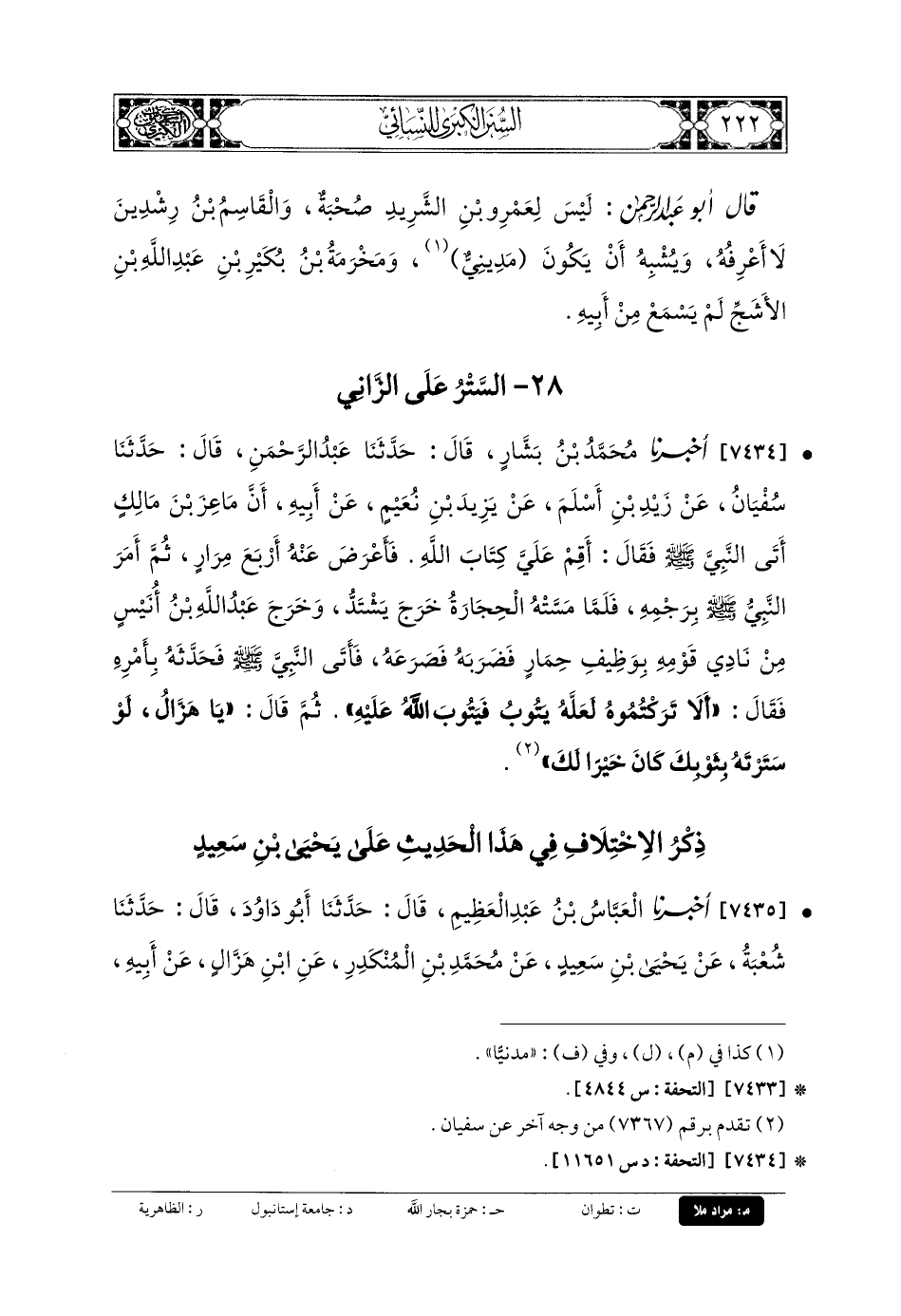 7434 - أَخبَرنا مُحَمدُ بنُ بَشَّارٍ، قَالَ: حَدَّثنا عَبدُ الرَّحمَنِ، قَالَ: حَدَّثنا سُفيانُ، عَن زَيْدِ بنِ أَسْلَمَ، عَن يَزِيدَ بنِ نُعَيْمٍ، عَن أَبيهِ، أَنَّ مَاعِزَ بْنَ مَالِكٍ أَتَى النَّبيَّ صَلى الله عَلَيهِ وسَلم فَقَالَ: أَقِمْ عَلَيَّ كِتَابَ اللهِ، فَأَعْرَضَ عَنهُ أَرْبَعَ مِرَارٍ، ثُمَّ أَمَرَ النَّبيُّ صَلى الله عَلَيهِ وسَلم بِرَجْمِهِ، فَلَمَّا مَسَّتْهُ الحِجَارَةُ، خَرَجَ يَشْتَدُّ، وَخَرَجَ عَبدُ اللهِ بنُ أُنَيْسٍ مِنْ نَادِي قَوْمِهِ بِوَظِيفِ حِمَارٍ فَضَرَبَهُ، فَصَرَعَهُ، فَأَتَى النَّبيَّ صَلى الله عَلَيهِ وسَلم فَحَدَّثَهُ بِأَمْرِهِ، فَقَالَ: أَلا تَرَكْتُمُوهُ لَعَلَّهُ يَتُوبُ، فَيَتُوبَ اللهُ عَلَيْهِ، ثُمَّ قَالَ: يَا هَزَّالُ لَوْ سَتَرْتَهُ بِثَوْبِكَ كَانَ خَيْرًا لَكَ.