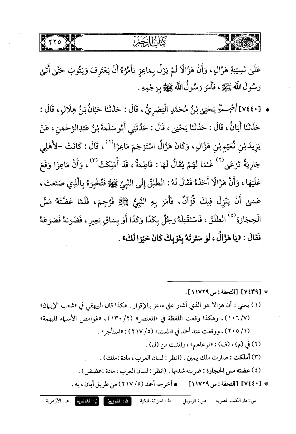 7440- أَخبَرنا يَحْيَى بنُ مُحَمدٍ البَصْرِيُّ، قَالَ: حَدَّثنا حَبَّانُ بنُ هِلالٍ، قَالَ: حَدَّثنا أَبَانُ، قَالَ: حَدَّثنا يَحْيَى، قَالَ: حَدَّثني أَبو سَلَمَةَ بنُ عَبدِ الرَّحمَنِ، عَن يَزِيدَ بنِ نُعَيْمِ بنِ هَزَّالٍ، وَكَانَ هَزَّالٌ اسْتَرْجَمَ مَاعِزًا، قَالَ: كَانَتْ لأَهْلِي جَارِيَةٌ تَرْعَى غَنَمًا لَهُمْ يُقَالُ لَهَا: فَاطِمَةُ قَدْ أُمْلِكَتْ، وَأَنَّ مَاعِزًا وَقَعَ عَلَيْهَا، وَأَنَّ هَزَّالاً أَخَذَهُ، فَقَالَ لَهُ: انْطَلِقْ إِلَى النَّبيِّ صَلى الله عَلَيهِ وسَلم فَتُخْبِرَهُ بِالَّذِي صَنَعْتَ، عَسَى أَنْ يَنْزِلَ فِيكَ قُرْآنٌ، فَأَمَرَ بِهِ النَّبيُّ صَلى الله عَلَيهِ وسَلم فَرُجِمَ فَلَمَّا عَضَّتْهُ مَسُّ الحِجَارَةِ انْطَلَقَ، فَاسْتَقْبَلَهُ رَجُلٌ بِكَذَا وَكَذَا، أَوْ بِسَاقِ بَعِيرٍ فَضَرَبَهُ فَصَرَعَهُ، فَقَالَ: يَا هَزَّالُ، لَوْ سَتَرْتَهُ بِثَوْبِكَ كَانَ خَيْرًا لَكَ.