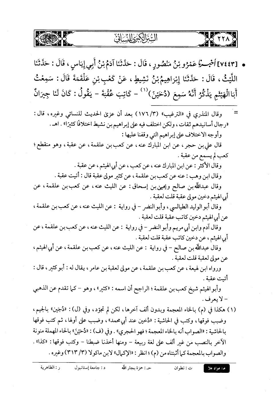 7443- أَخبَرنا عَمْرُو بنُ مَنْصُورٍ، قَالَ: حَدَّثنا آدَمُ بنُ أَبي إِيَاسٍ، قَالَ: حَدَّثنا اللَّيْثُ، قَالَ: حَدَّثنا إِبْرَاهِيمُ بنُ نَشِيطٍ، عَن كَعْبِ بنِ عَلْقَمَةَ، قَالَ: سَمِعْتُ أَبَا الهَيْثَمِ يَذْكُرُ، أَنَّهُ سَمِعَ دُخَيْنًا كَاتِبَ عُقْبَةَ يَقُولُ: كَانَ لَنَا جِيرَانُ يَشْرَبُونَ الخَمْرَ فَنَهَيْتُهُمْ فَلَمْ يَنْتَهُوا، فَقُلْتُ لِعُقْبَةَ بنِ عَامِرٍ: إِنَّهُمْ يَشْرَبُونَ الخَمْرَ وَقَدْ نَهَيْتُهُمْ، فَلَمْ يَنْتَهُوا، فَأَدْعُو لَهُمْ بِالشُّرَطِ؟ قَالَ: لا، ثُمَّ عَاوَدْتُهُ، قَالَ: دَعْهُمْ، فَإِنِّي سَمِعْتُ رَسُولَ اللهِ صَلى الله عَلَيهِ وسَلم يَقُولُ: مَنْ رَأَى عَوْرَةً مِنْ مُسْلِمٍ فَسَتَرَهَا، فَكَأَنَّمَا اسْتَحْيَا مَوْؤودَةً.