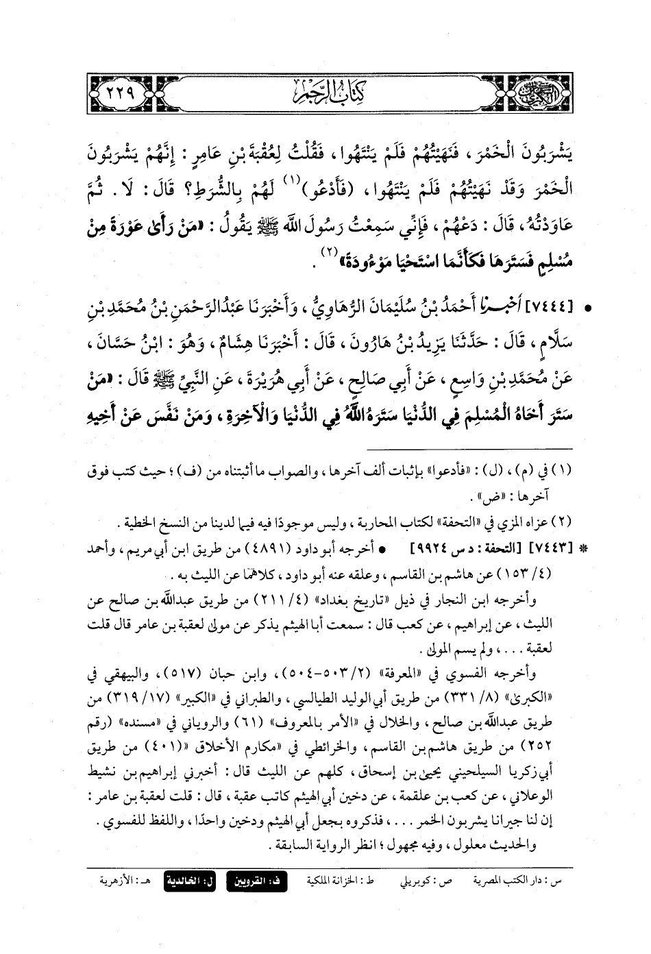 7444- أَخبَرنا أَحْمَدُ بنُ سُلَيْمَانَ الرُّهَاوِيُّ (ح) وَأَخبَرنا عَبدُ الرَّحمَنِ بنُ مُحَمدِ بنِ سَلاَّمٍ، قَالا: حَدَّثنا يَزِيدُ بنُ هَارُونَ، قَالَ: أَخبَرنا هِشَامٌ، وَهُوَ ابْنُ حَسَّانَ، عَن مُحَمدِ بنِ وَاسِعٍ، عَن أَبي صَالِحٍ، عَن أَبي هُرَيْرَةَ، عَنِ النَّبيِّ صَلى الله عَلَيهِ وسَلم قَالَ: مَنْ سَتَرَ أَخَاهُ المُسْلِمَ فِي الدُّنْيَا، سَتَرَهُ اللهُ فِي الدُّنْيَا وَالآخِرَةِ، وَمَنْ نَفَّسَ عَن أَخِيهِ كُرْبَةً مِنْ كُرَبِ الدُّنْيَا، نَفَّسَ اللهُ عَنهُ كُرْبَةً مِنْ كُرَبِ يَوْمِ القِيَامَةِ، وَاللهُ فِي عَوْنِ العَبدِ مَا كَانَ العَبدُ فِي عَوْنِ أَخِيهِ.