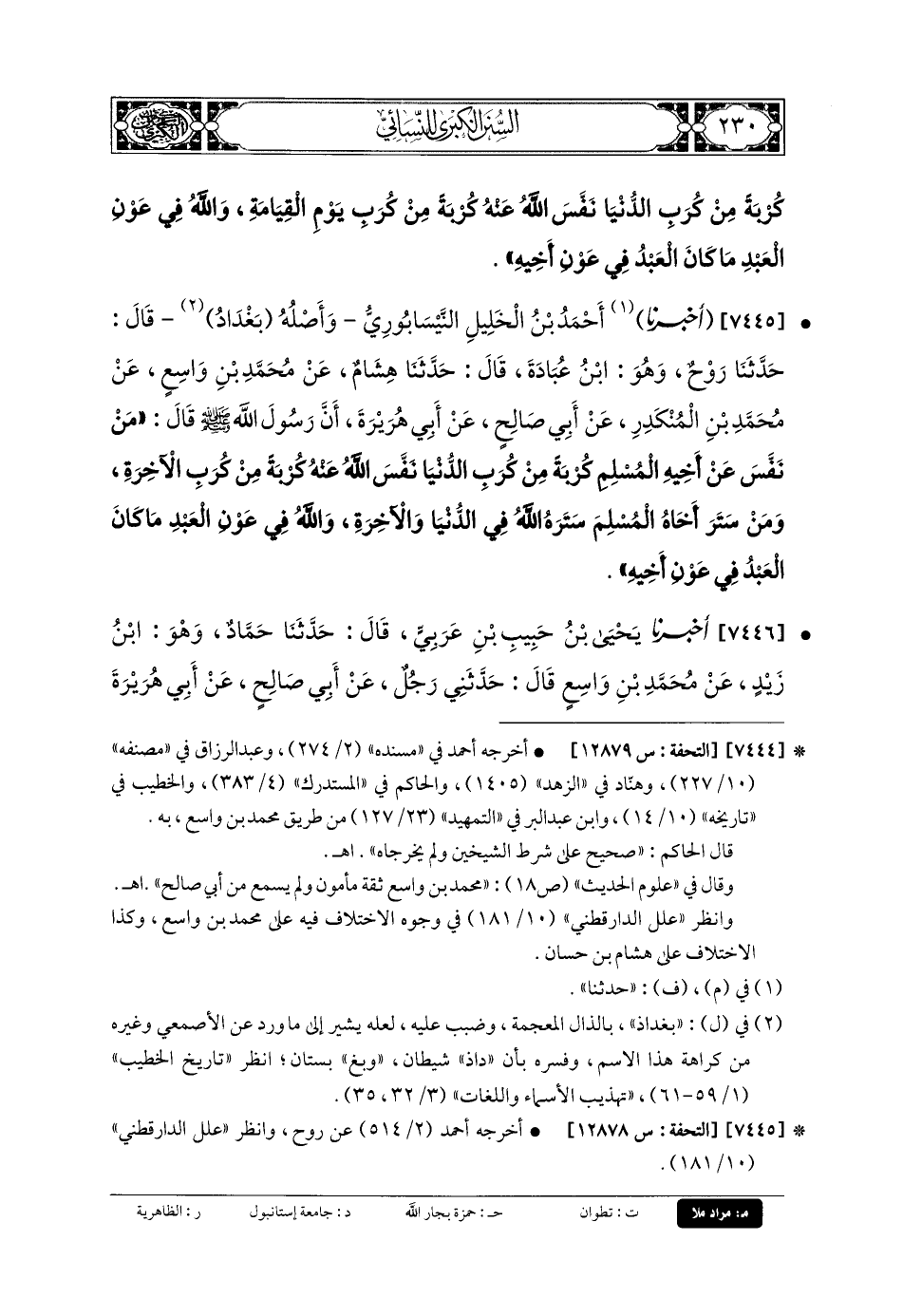 7445- أَخبَرنا أَحْمَدُ بنُ الخَلِيلِ النَّيْسَابُورِيُّ، وَأَصْلُهُ بَغْدَادِيُّ، قَالَ: حَدَّثنا رَوْحٌ، وَهُوَ ابْنُ عُبَادَةَ، قَالَ: حَدَّثنا هِشَامٌ، عَن مُحَمدِ بنِ وَاسِعٍ، عَن مُحَمدِ بنِ المُنْكَدِرِ، عَن أَبي صَالِحٍ، عَن أَبي هُرَيْرَةَ، أَنَّ رَسُولَ اللهِ صَلى الله عَلَيهِ وسَلم قَالَ: مَنْ نَفَّسَ عَن أَخِيهِ المُسْلِمِ كُرْبَةً مِنْ كُرَبِ الدُّنْيَا، نَفَّسَ اللهُ عَنهُ كُرْبَةً مِنْ كُرَبِ الآخِرَةِ، وَمَنْ سَتَرَ أَخَاهُ المُسْلِمَ، سَتَرَهُ اللهُ فِي الدُّنْيَا وَالآخِرَةِ، وَاللهُ فِي عَوْنِ العَبدِ مَا كَانَ العَبدُ فِي عَوْنِ أَخِيهِ.
