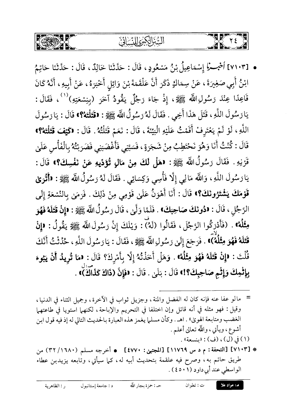 7103- أَخبَرنا إِسمَاعِيلُ بنُ مَسْعُودٍ، قَالَ: حَدَّثنا خَالِدٌ، قَالَ: حَدَّثنا حَاتِمُ بنُ أَبي صَغِيرَةَ، عَن سِمَاكٍ، ذَكَرَ أَنَّ عَلْقَمَةَ بْنَ وَائِلٍ أَخْبَرَهُ، عَن أَبيهِ، أَنَّهُ كَانَ قَاعِدًا عِنْدَ رَسُولِ اللهِ صَلى الله عَلَيهِ وسَلم، إِذْ جَاءَ رَجُلٌ يَقُودُ آخَرَ بِنِسْعَتِهِ، فَقَالَ: يَا رَسُولَ اللهِ، قَتَلَ هَذَا أَخِي، فَقَالَ لَهُ رَسُولُ اللهِ صَلى الله عَلَيهِ وسَلم: قَتَلْتَهُ؟ قَالَ: يَا رَسُولَ اللهِ، لَوْ لَمْ يَعْتَرِفْ أَقَمْتُ عَلَيْهِ البَيِّنَةَ، قَالَ: نَعَمْ قَتَلْتُهُ، قَالَ: كَيْفَ قَتَلْتَهُ؟ قَالَ: كُنْتُ أَنَا وَهُوَ نَحْتَطِبُ مِنْ شَجَرَةٍ، فَسَبَّنِي فَأَغْضَبَنِي، فَضَرَبْتُ بِالفَأْسِ عَلَى قَرْنِهِ، فَقَالَ لَهُ رَسُولُ اللهِ صَلى الله عَلَيهِ وسَلم: هَلْ لَكَ مِنْ مَالٍ تُؤَدِّيهِ عَن نَفْسِكَ؟ قَالَ: يَا رَسُولَ اللهِ، وَاللهِ مَا لِي إِلاَّ فَأْسِي وَكِسَائِي، فَقَالَ لَهُ رَسُولُ اللهِ صَلى الله عَلَيهِ وسَلم: أَتَرَى قَوْمَكَ يَشْتَرُونَكَ؟ قَالَ: أَنَا أَهْوَنُ عَلَى قَوْمِي مِنْ ذَلِكَ، فَرَمَى بِالنِّسْعَةِ إِلَى الرَّجُلِ، قَالَ: دُونَكَ صَاحِبَكَ، فَلَمَّا وَلَّى، قَالَ رَسُولُ اللهِ صَلى الله عَلَيهِ وسَلم: إِنْ قَتَلَهُ فَهُوَ مِثْلُهُ، فَأَدْرَكُوا الرَّجُلَ، فَقَالُوا لَهُ: وَيْلَكَ، إِنَّ رَسُولَ اللهِ صَلى الله عَلَيهِ وسَلم يَقُولُ: إِنْ قَتَلَهُ فَهُوَ مِثْلُهُ، فَرَجَعَ إِلَى رَسُولِ اللهِ صَلى الله عَلَيهِ وسَلم، فَقَالَ يَا رَسُولَ اللهِ، حُدِّثْتُ أَنَّكَ قُلْتَ: إِنْ قَتَلَهُ فَهُوَ مِثْلُهُ، وَهَلْ أَخَذْتُهُ إِلاَّ بِأَمْرِكَ؟ قَالَ: مَا تُرِيدُ أَنْ يَبُوءَ بِإِثْمِكَ، وَإِثْمِ صَاحِبِكَ، قَالَ: بَلَى، قَالَ: فَإِنَّ ذَاكَ كَذَاكَ.