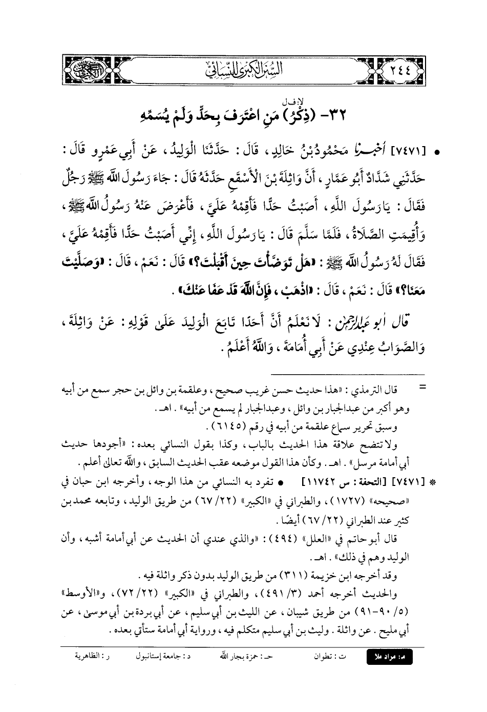 7471- أَخبَرنا مَحْمُودُ بنُ خَالِدٍ، قَالَ: حَدَّثنا الوَلِيدُ، عَن أَبي عَمْرٍو، قَالَ: حَدَّثني شَدَّادٌ أَبو عَمَّارٍ، أَنَّ وَاثِلَةَ بْنَ الأَسْقَعِ حَدَّثَهُ قَالَ: جَاءَ رَسُولَ اللهِ صَلى الله عَلَيهِ وسَلم رَجُلٌ، فَقَالَ: يَا رَسُولَ اللهِ، أَصَبْتُ حَدًّا فَأَقِمْهُ عَلَيَّ، فَأَعْرَضَ عَنهُ رَسُولُ اللهِ صَلى الله عَلَيهِ وسَلم، وَأُقِيمَتِ الصَّلاةُ، فَلَمَّا سَلَّمَ، قَالَ: يَا رَسُولَ اللهِ، إِنِّي أَصَبْتُ حَدًّا فَأَقِمْهُ عَلَيَّ، فَقَالَ لَهُ رَسُولُ اللهِ صَلى الله عَلَيهِ وسَلم: هَلْ تَوَضَّأْتَ حِينَ أَقْبَلْتَ؟ قَالَ: نَعَمْ، قَالَ: وَصَلَّيْتَ مَعَنَا؟ قَالَ: نَعَمْ، قَالَ: فَاذْهَبْ فَإِنَّ اللهَ قَدْ عَفَا عَنكَ.