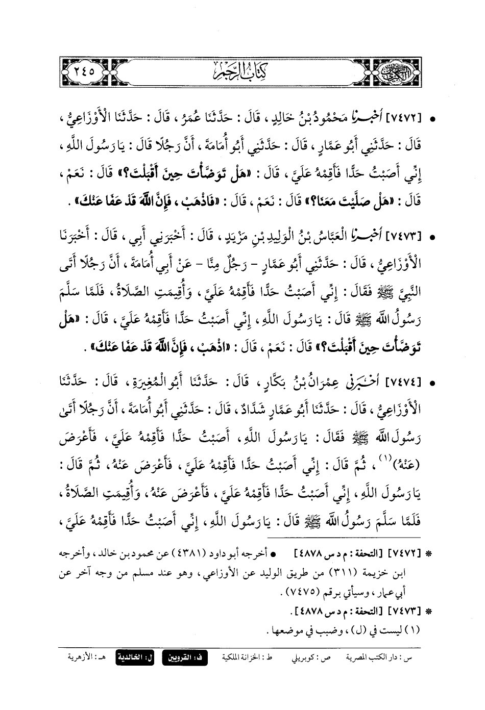 7474- أَخْبَرَنِي عِمْرَانُ بنُ بَكَّارٍ، قَالَ: حَدَّثنا أَبو المُغِيرَةِ، قَالَ: حَدَّثنا الأَوْزَاعِيُّ، قَالَ: حَدَّثنا أَبو عَمَّارٍ شَدَّادٌ، قَالَ: حَدَّثني أَبو أُمَامَةَ، أَنَّ رَجُلاً أَتَى رَسُولَ اللهِ صَلى الله عَلَيهِ وسَلم فَقَالَ: يَا رَسُولَ اللهِ، أَصَبْتُ حَدًّا فَأَقِمْهُ عَلَيَّ، فَأَعْرَضَ عَنهُ، ثُمَّ قَالَ: إِنِّي أَصَبْتُ حَدًّا فَأَقِمْهُ عَلَيَّ، فَأَعْرَضَ عَنهُ، ثُمَّ قَالَ: يَا رَسُولَ اللهِ، إِنِّي أَصَبْتُ حَدًّا فَأَقِمْهُ عَلَيَّ، فَأَعْرَضَ عَنهُ، وَأُقِيمَتِ الصَّلاةُ، فَلَمَّا سَلَّمَ رَسُولُ اللهِ صَلى الله عَلَيهِ وسَلم قَالَ: يَا رَسُولَ اللهِ، إِنِّي أَصَبْتُ حَدًّا فَأَقِمْهُ عَلَيَّ، فَقَالَ: هَلْ تَوَضَّأْتَ حِينَ أَقْبَلْتَ؟ قَالَ: نَعَمْ، قَالَ: هَلْ صَلَّيْتَ مَعَنَا حِينَ صَلَّيْنَا؟ قَالَ: نَعَمْ، قَالَ: اذْهَبْ فَإِنَّ اللهَ قَدْ عَفَا عَنكَ.