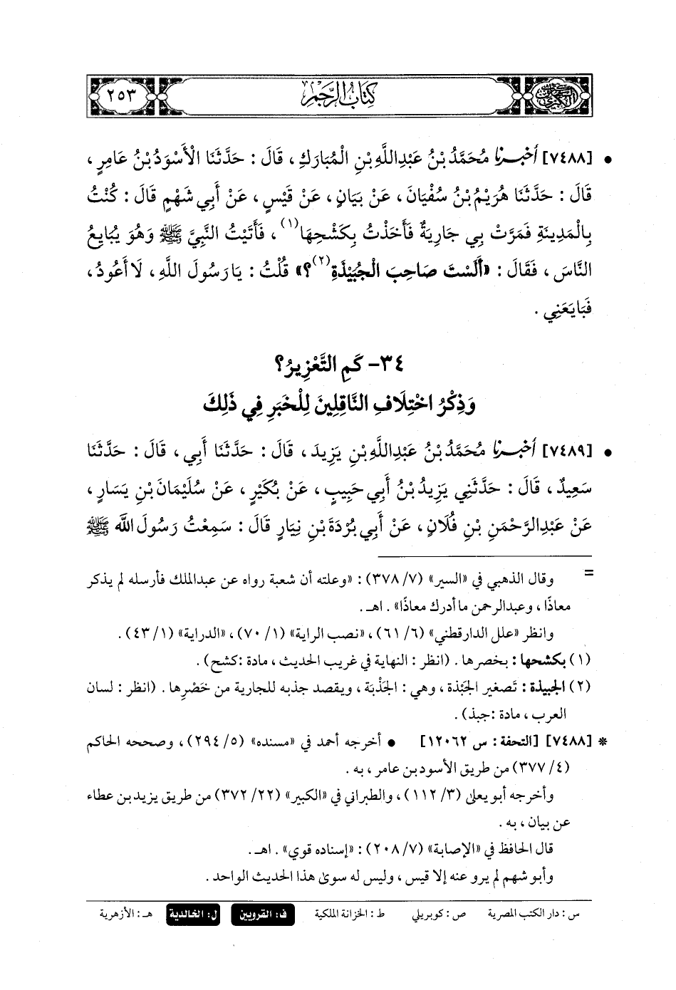 7488- أَخبَرنا مُحَمدُ بنُ عَبدِ اللهِ بنِ المُبَارَكِ، قَالَ: حَدَّثنا الأَسْوَدُ بنُ عَامِرٍ، قَالَ: حَدَّثنا هُرَيْمُ بنُ سُفيانَ، عَن بَيَانٍ، عَن قَيْسٍ، عَن أَبي شَهْمٍ، قَالَ: كُنْتُ بِالمَدِينَةِ، فَمَرَّتْ بِي جَارِيَةٌ، فَأَخَذْتُ بِكَشْحِهَا، فَأَتَيْتُ النَّبيَّ صَلى الله عَلَيهِ وسَلم وَهُوَ يُبَايِعُ النَّاسَ، فَقَالَ: أَلَسْتَ صَاحِبَ الجُبَيْذَةَ؟ قُلْتُ يَا رَسُولَ اللهِ: لا أَعُودُ فَبَايِعْنِي.