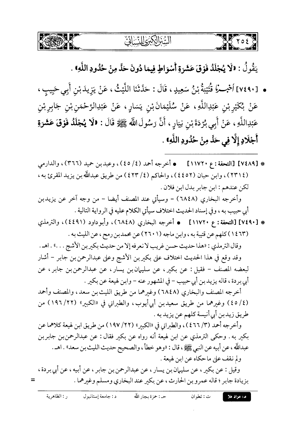 7490- أَخبَرنا قُتَيبَةُ بنُ سَعِيدٍ، قَالَ: حَدَّثنا اللَّيْثُ، عَن يَزِيدَ بنِ أَبي حَبِيبٍ، عَن بُكَيْرِ بنِ عَبدِ اللهِ، عَن سُلَيْمَانَ بنِ يَسَارٍ، عَن عَبدِ الرَّحمَنِ بنِ جَابِرِ بنِ عَبدِ اللهِ، عَن أَبي بُرْدَةَ بنِ نِيَارٍ، أَنَّ رَسُولَ اللهِ صَلى الله عَلَيهِ وسَلم قَالَ: لا يُجْلَدُ فَوْقَ عَشَرَةِ أَجْلادٍ، إِلاَّ فِي حَدٍّ مِنْ حُدُودِ اللهِ.