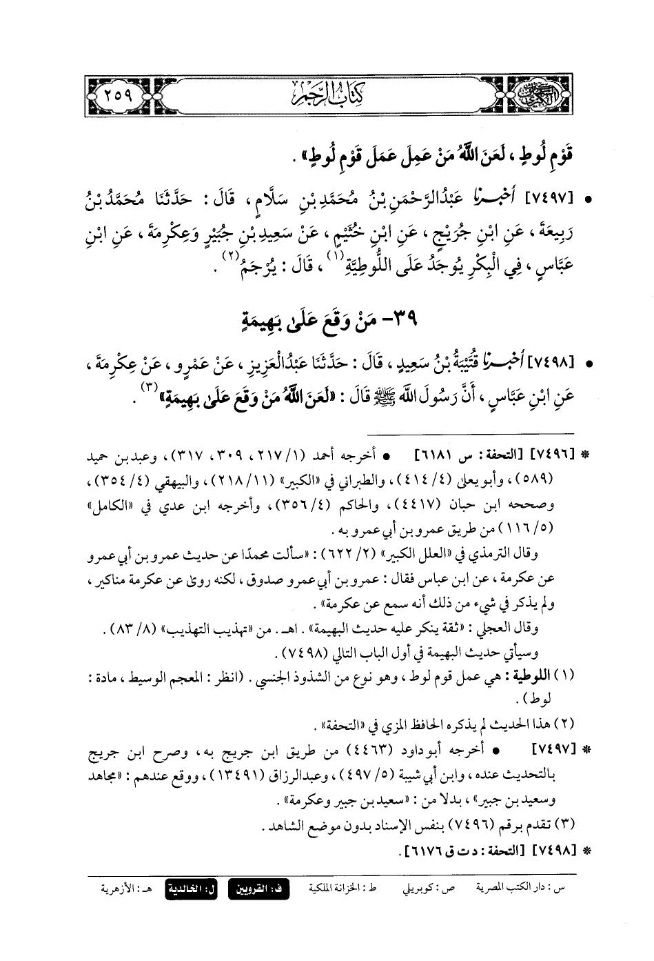 7498- أَخبَرنا قُتَيبَةُ بنُ سَعِيدٍ، قَالَ: حَدَّثنا عَبدُ العَزِيزِ، عَن عَمْرٍو، عَن عِكْرِمَةَ، عَنِ ابْنِ عَبَّاسٍ، أَنَّ رَسُولَ اللهِ صَلى الله عَلَيهِ وسَلم قَالَ: لَعَنَ اللهُ مَنْ وَقَعَ عَلَى بَهِيمَةٍ.