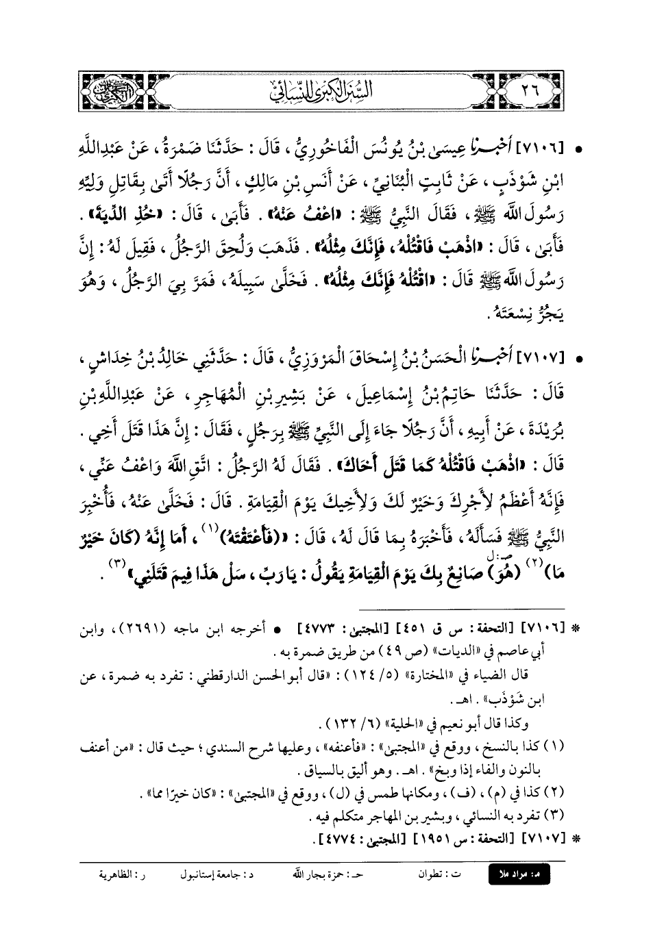 7106- أَخبَرنا عِيسَى بنُ يُونُسَ الفَاخُورِيُّ، قَالَ: حَدثنا ضَمْرَةُ، عَن عَبدِ اللهِ بنِ شَوْذَبٍ، عَن ثَابِتٍ البُنَانِيِّ، عَن أَنَسِ بنِ مَالِكٍ، أَنَّ رَجُلاً أَتَى بِقَاتِلِ وَلِيِّهِ رَسُولَ اللهِ صَلى الله عَلَيهِ وسَلم، فَقَالَ النَّبيُّ صَلى الله عَلَيهِ وسَلم: اعْفُ عَنهُ، فَأَبَى، قَالَ: خُذِ الدِّيَةَ، فَأَبَى، قَالَ: اذْهَبْ فَاقْتُلْهُ، فَإِنَّكَ مِثْلُهُ، فَذَهَبَ، وَلُحِقَ الرَّجُلُ، فَقِيلَ لَهُ: إِنَّ رَسُولَ اللهِ صَلى الله عَلَيهِ وسَلم قَالَ: اقْتُلْهُ، فَإِنَّكَ مِثْلُهُ، فَخَلَّى سَبِيلَهُ، فَمَرَّ بِي الرَّجُلُ وَهُوَ يَجُرُّ نِسْعَتَهُ.
