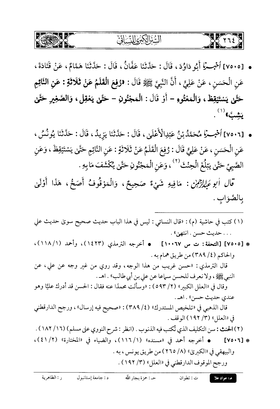7505- أَخبَرنا أَبو دَاوُدَ، قَالَ: حَدَّثنا عَفَّانُ، قَالَ: حَدَّثنا هَمَّامٌ، عَن قَتَادَةَ، عَنِ الحَسَنِ، عَن عَليٍّ، أَنَّ النَّبيَّ صَلى الله عَلَيهِ وسَلم قَالَ: رُفِعَ القَلَمُ عَن ثَلاثَةٍ: عَنِ النَّائِمِ حَتَّى يَسْتَيْقِظَ، وَالمَعْتُوهِ أَوْ قَالَ: المَجْنُونِ حَتَّى يَعْقِلَ، وَالصَّغِيرِ حَتَّى يَشِبَّ.
