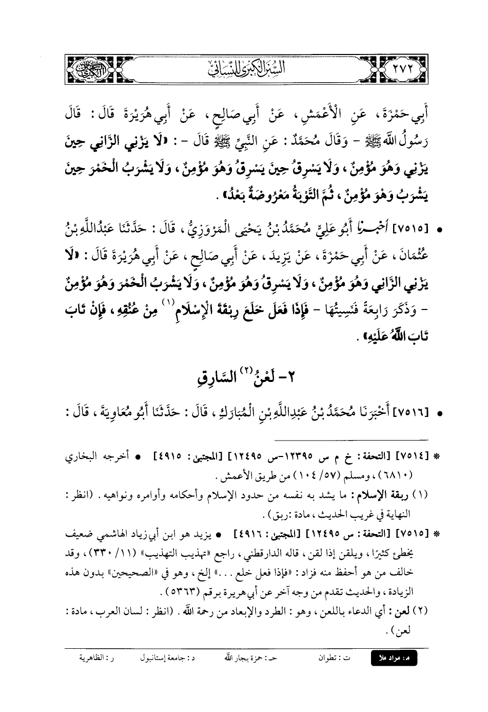 7516- أَخبَرنا مُحَمدُ بنُ عَبدِ اللهِ بنِ المُبَارَكِ، قَالَ: حَدَّثنا أَبو مُعاويَةَ، قَالَ: حَدَّثنا الأَعْمَشُ (ح) وَأَخبَرنا أَحْمَدُ بنُ حَرْبٍ، قَالَ: حَدَّثنا أَبو مُعاويَةَ، عَنِ الأَعْمَشِ، عَن أَبي صَالِحٍ، عَن أَبي هُرَيْرَةَ، قَالَ: قَالَ رَسُولُ اللهِ صَلى الله عَلَيهِ وسَلم: لَعَنَ اللهُ السَّارِقَ يَسْرِقُ البَيْضَةَ، فَتُقْطَعُ يَدُهُ، وَيَسْرِقُ الحَبْلَ، فَتُقْطَعَ يَدُهُ.