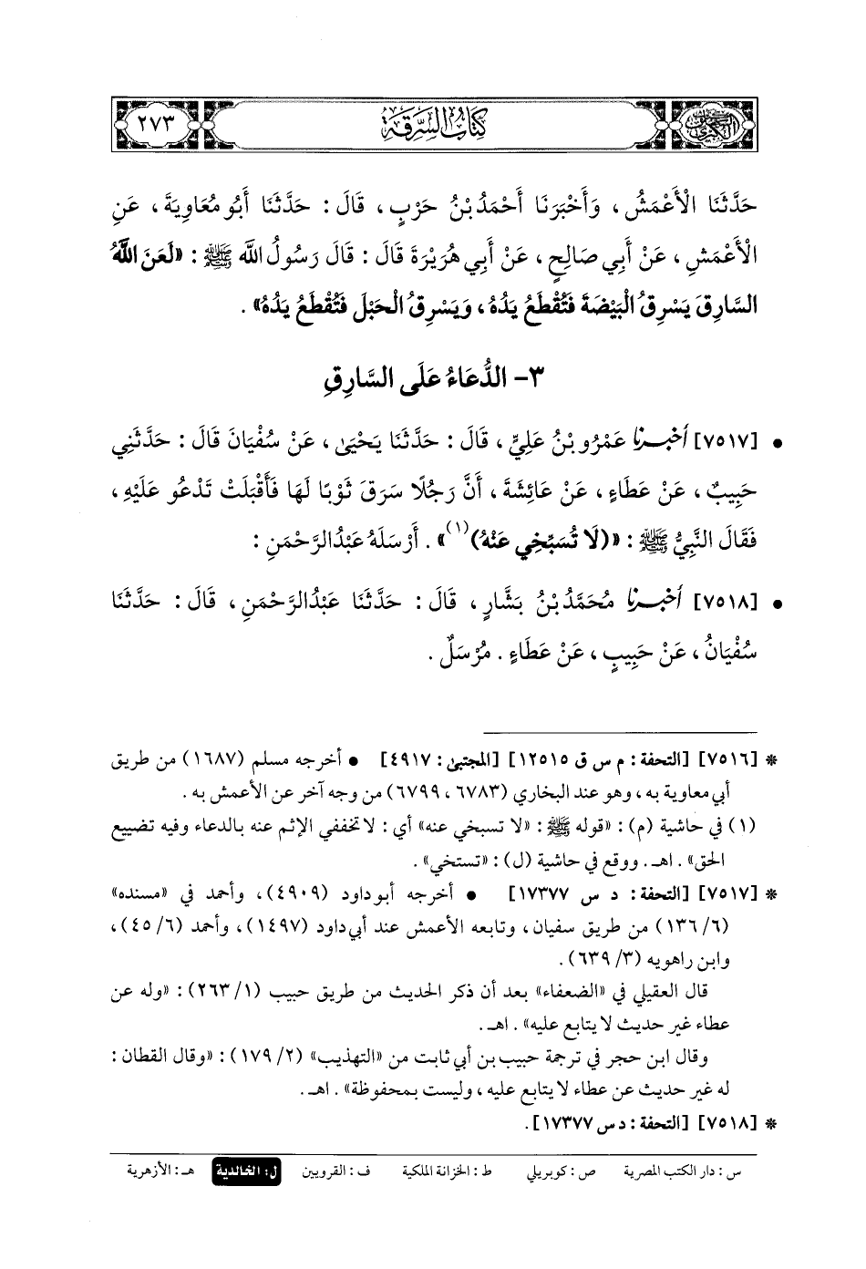7517- أَخبَرنا عَمْرُو بنُ عَليٍّ، قَالَ: حَدَّثنا يَحْيَى، عَن سُفيانَ، قَالَ: حَدَّثني حَبِيبٌ، عَن عَطَاءٍ، عَن عَائِشَةَ، أَنَّ رَجُلاً سَرَقَ ثَوْبًا لَهَا، فأَقْبَلَتْ تَدْعُو عَلَيهِ، فَقَالَ النَّبيُّ صَلى الله عَلَيهِ وسَلم: لا تُسَبِّخِي عَنهُ.