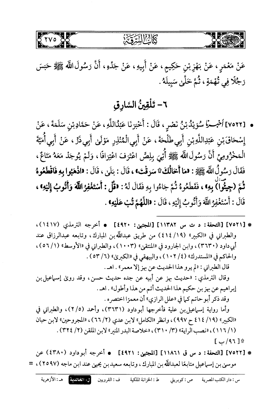 7522- أَخبَرنا سُوَيْدُ بنُ نَصْرٍ، قَالَ: أَخبَرنا عَبدُ اللهِ، عَن حَمَّادِ بنِ سَلَمَةَ، عَن إِسحَاقَ بنِ عَبدِ اللهِ بنِ أَبي طَلْحَةَ، عَن أَبي المُنْذِرِ، مَوْلَى أَبي ذَرٍّ، عَن أَبي أُمَيَّةَ المَخْزُومِيِّ، أَنَّ رَسُولَ اللهِ صَلى الله عَلَيهِ وسَلم أُتِيَ بِلِصٍّ اعْتَرَفَ اعْتِرَافًا، وَلَمْ يُوجَدْ مَعَهُ مَتَاعٌ، فَقَالَ رَسُولُ اللهِ صَلى الله عَلَيهِ وسَلم: مَا أَخَالُكَ سَرَقْتَ؟ قَالَ: بَلَى، قَالَ: اذْهَبُوا بِهِ فَاقْطَعُوهُ، ثُمَّ جِيئوا بِهِ فَقَطَعُوهُ، ثُمَّ جَاؤُوا بِهِ، فَقَالَ لَهُ: قُلْ: أَسْتَغْفِرُ اللهَ وَأَتُوبُ إِلَيْهِ، قَالَ: أَسْتَغْفِرُ اللهَ وَأَتُوبُ إِلَيْهِ، قَالَ: اللهُمَّ تُبْ عَلَيْهِ.