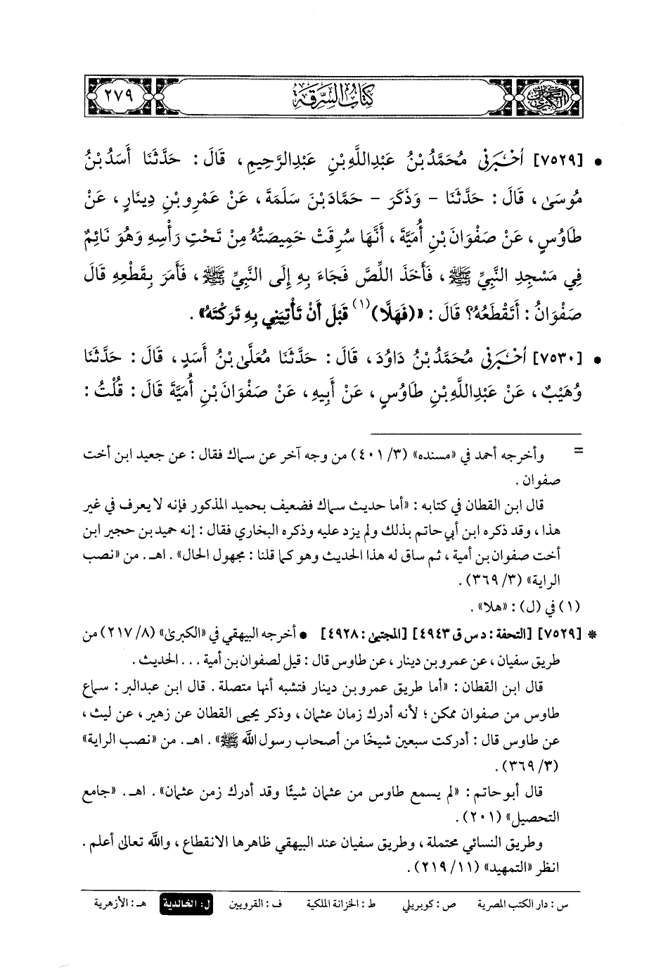 7529- أَخبَرنِي مُحَمدُ بنُ عَبدِ اللهِ بنِ عَبدِ الرَّحِيمِ، قَالَ: حَدَّثنا أَسَدُ بنُ مُوسَى، قَالَ: حَدَّثنا وَذَكَرَ حَمَّادَ بْنَ سَلَمَةَ، عَن عَمْرِو بنِ دِينَارٍ، عَن طَاوُوسٍ، عَن صَفْوَانَ بنِ أُمَيَّةَ، أَنَّهَا سُرِقَتْ خَمِيصَتُهُ مِنْ تَحْتِ رَأْسِهِ وَهُوَ نَائِمٌ فِي مَسْجِدِ النَّبيِّ صَلى الله عَلَيهِ وسَلم، فَأَخَذَ اللِّصَّ، فَجَاءَ بِهِ إِلَى النَّبيِّ صَلى الله عَلَيهِ وسَلم، فَأَمَرَ بِقَطْعِهِ، قَالَ صَفْوَانُ: أَتَقْطَعُهُ؟ قَالَ: فَهَلاَّ قَبْلَ أَنْ تَأْتِيَنِي بِهِ تَرَكْتَهُ؟.