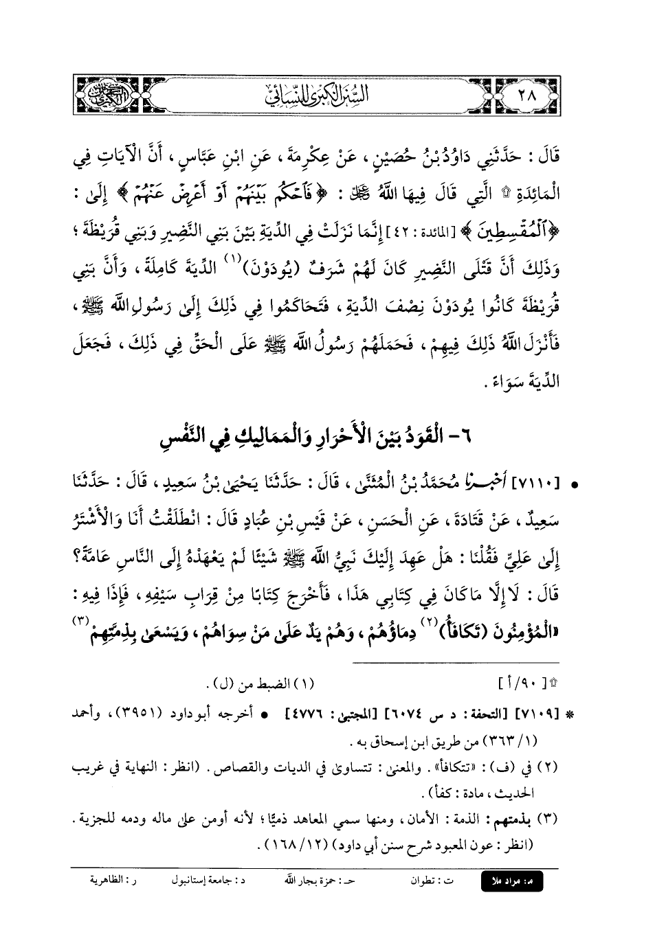 7110 - أَخبَرني مُحَمدُ بنُ المُثَنَّى، قَالَ: حَدثنا يَحيَى بنُ سَعِيدٍ، قَالَ: حَدثنا سَعِيدٌ، عَن قَتَادَةَ، عَنِ الحَسَنِ، عَن قَيْسِ بنِ عُبَادٍ، قَالَ: انْطَلَقْتُ أَنَا وَالأَشْتَرُ إِلَى عَليٍّ، فَقُلْنَا: هَلْ عَهِدَ إِلَيْكَ نَبِيُّ اللهِ صَلى الله عَلَيهِ وسَلم شَيْئًا لَمْ يَعْهَدْهُ إِلَى النَّاسِ عَامَّةً؟ قَالَ: لا، إِلاَّ مَا كَانَ فِي كِتَابِي هَذَا، فَأَخْرَجَ كِتَابًا مِنْ قِرَابِ سَيْفِهِ، فَإِذَا فِيهِ: المُؤْمِنُونَ تَكَافَأُ دِمَاؤُهُمْ، وَهُمْ يَدٌ عَلَى مَنْ سِوَاهُمْ، وَيَسْعَى بِذِمَّتِهِمْ أَدْنَاهُمْ، أَلا لا يُقْتَلُ مُؤْمِنٌ بِكَافِرٍ، وَلا ذُو عَهْدٍ فِي عَهْدِهِ، مَنْ أَحْدَثَ حَدَثًا فَعَلَى نَفْسِهِ، أَوْ آوَى مُحْدِثًا فَعَلَيْهِ لَعْنَةُ اللهِ، وَالمَلائِكَةِ، وَالنَّاسِ أَجْمَعِينَ.