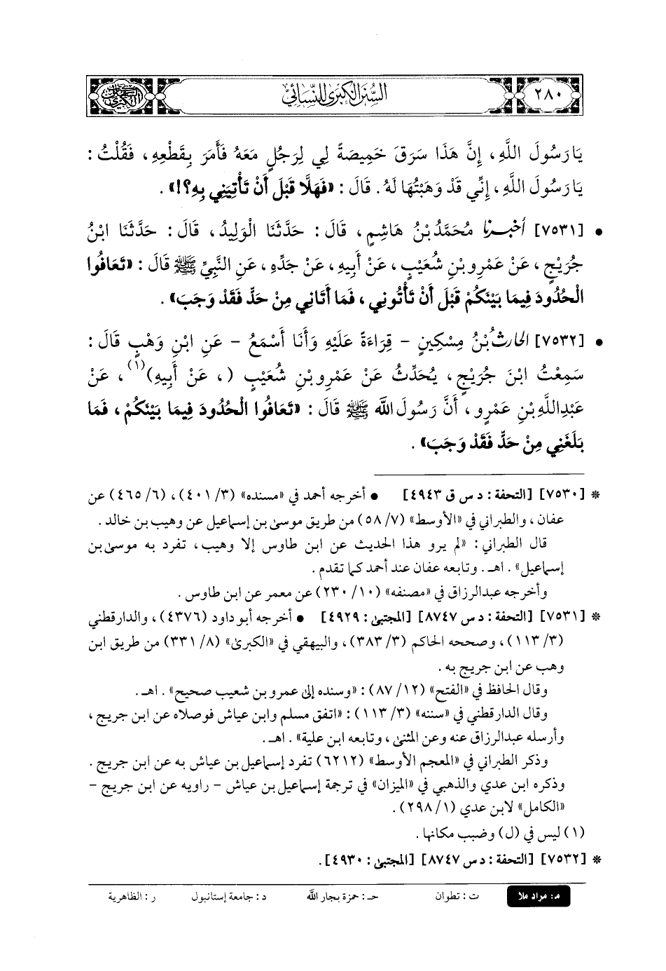 7531- أَخبَرنا مُحَمدُ بنُ هَاشِمٍ، قَالَ: حَدَّثنا الوَلِيدُ، قَالَ: حَدَّثنا ابْنُ جُرَيْجٍ، عَن عَمْرِو بنِ شُعَيْبٍ، عَن أَبيهِ، عَن جَدِّهِ، عَنِ النَّبيِّ صَلى الله عَلَيهِ وسَلم قَالَ: تَعَافُوا الحُدُودَ فِيمَا بَيْنَكُمْ قَبْلَ أَنْ تَأْتُونِي، فَمَا أَتَانِي مِنْ حَدٍّ فَقَدْ وَجَبَ.