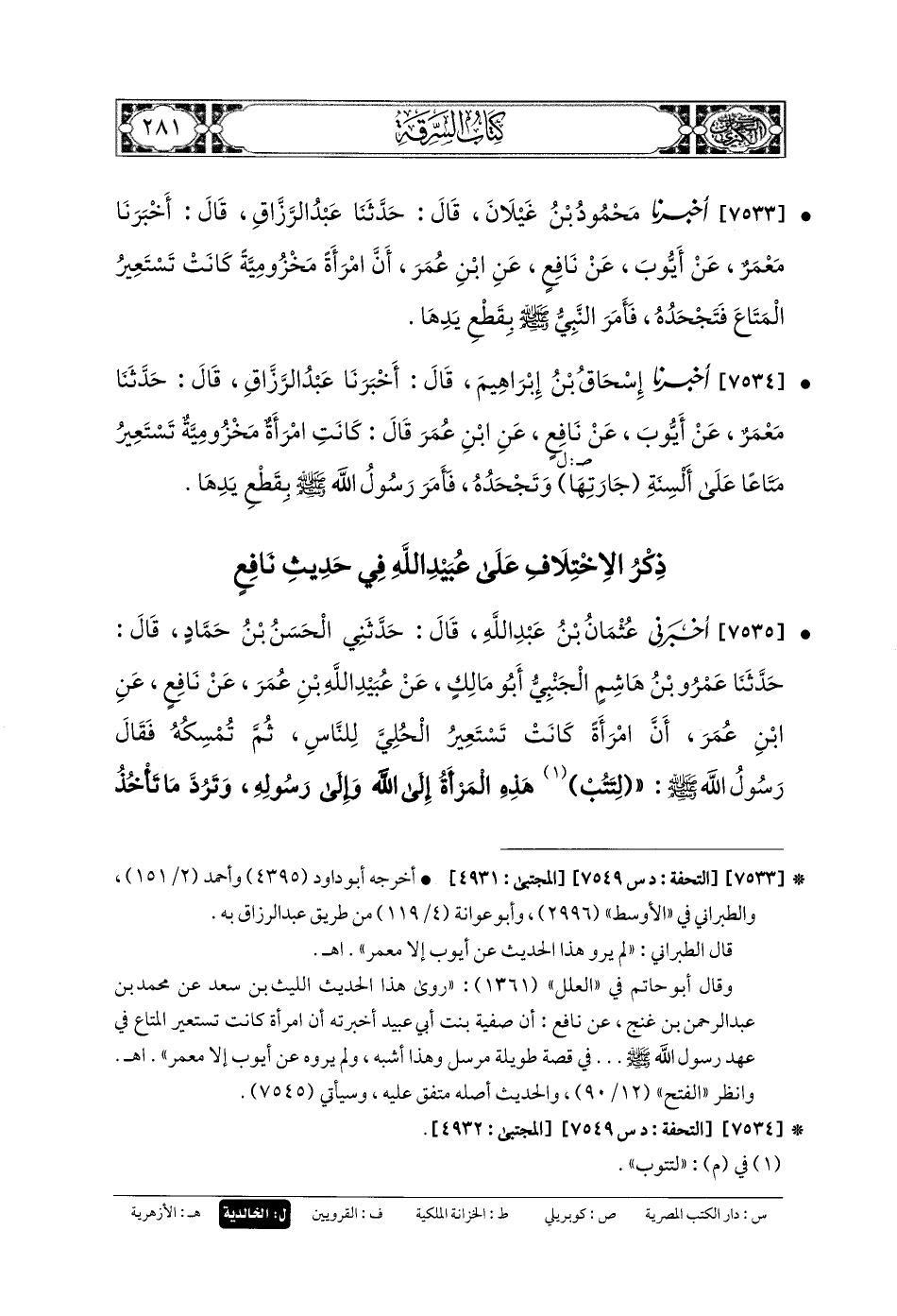 7533- أَخبَرنا مَحْمُودُ بنُ غَيْلانَ، قَالَ: حَدَّثنا عَبدُ الرَّزَّاقِ، قَالَ: أَخبَرنا مَعْمَرٌ، عَن أَيوبَ، عَن نَافِعٍ، عَنِ ابْنِ عُمَرَ، أَنَّ امْرَأَةً مَخْزُومِيَّةً كَانَتْ تَسْتَعِيرُ المَتَاعَ فَتَجْحَدُهُ، فَأَمَرَ النَّبيُّ صَلى الله عَلَيهِ وسَلم بِقَطْعِ يَدِهَا.