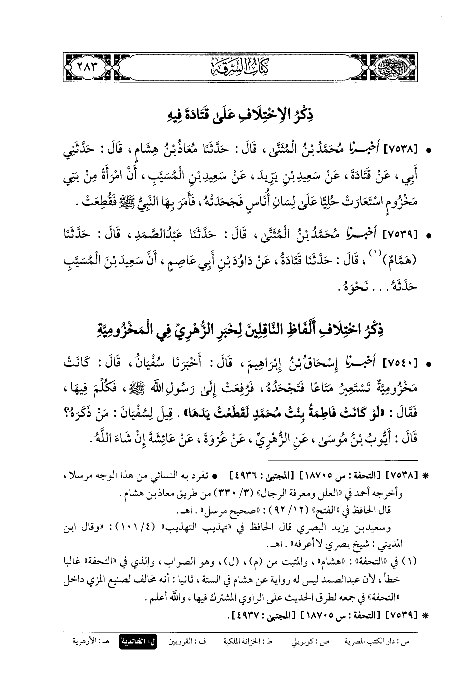 7538- أَخبَرنا مُحَمدُ بنُ المُثَنَّى، قَالَ: حَدَّثنا مُعَاذُ بنُ هِشَامٍ، قَالَ: حَدَّثني أَبي، عَن قَتَادَةَ، عَن سَعِيدِ بنِ يَزِيدَ، عَن سَعِيدِ بنِ المُسَيَّبِ، أَنَّ امْرَأَةً مِنْ بَنِي مَخْزُومٍ اسْتَعَارَتْ حُلِيًّا عَلَى لِسَانِ أُنَاسٍ فَجَحَدَتْهَا، فَأَمَرَ بِهَا النَّبيُّ صَلى الله عَلَيهِ وسَلم، فَقُطِعَتْ.