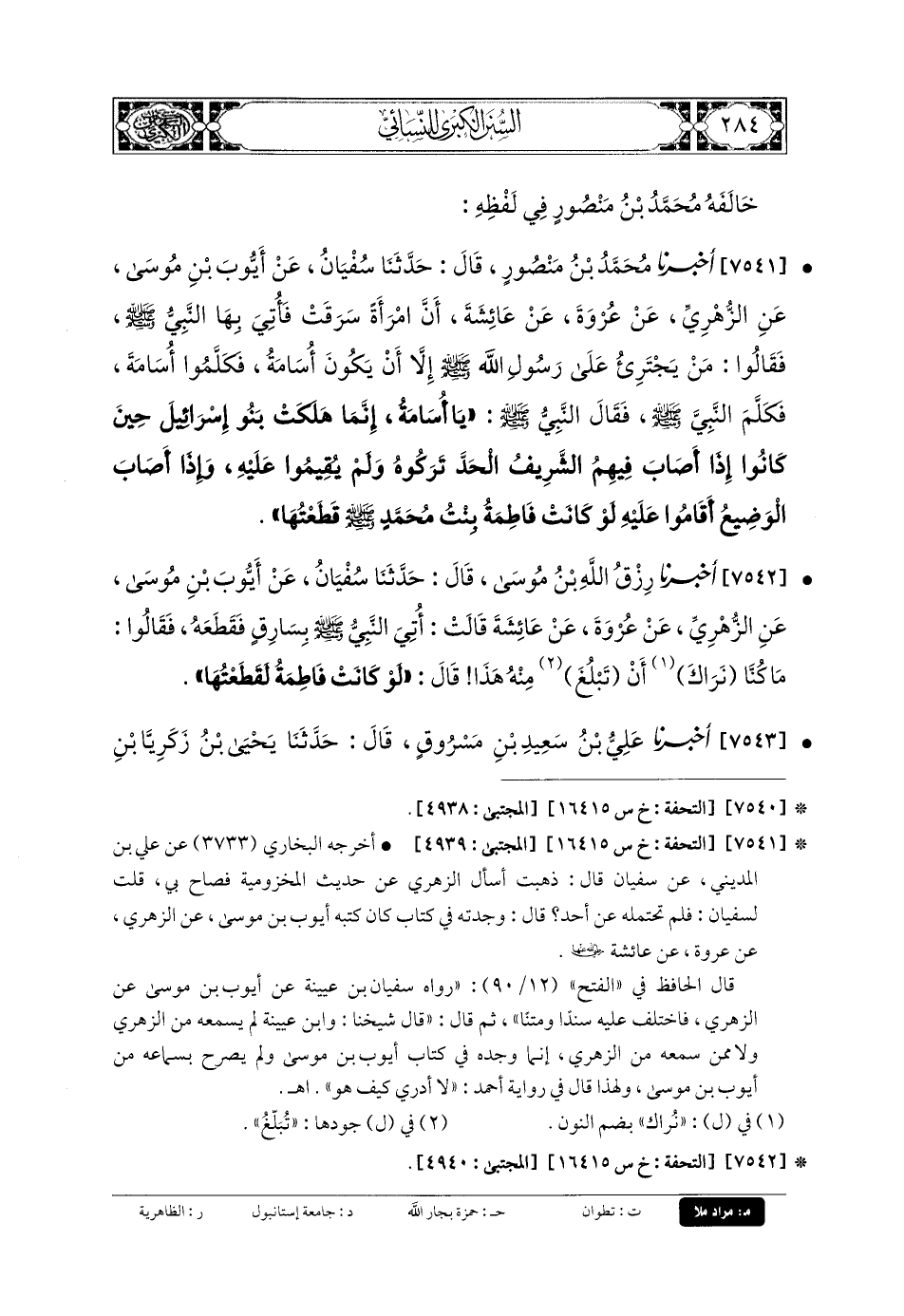 7541- أَخبَرنا مُحَمدُ بنُ مَنْصُورٍ، قَالَ: حَدَّثنا سُفيانُ، عَن أَيوبَ بنِ مُوسَى، عَنِ الزُّهْرِيِّ، عَن عُرْوَةَ، عَن عَائِشَةَ، أَنَّ امْرَأَةً سَرَقَتْ، فَأُتِيَ بِهَا النَّبيُّ صَلى الله عَلَيهِ وسَلم فَقَالُوا: مَنْ يَجْتَرِئُ عَلَى رَسُولِ اللهِ صَلى الله عَلَيهِ وسَلم، إِلاَّ أَنْ يَكُونَ أُسَامَةَ، فَكَلَّمُوا أُسَامَةَ، فَكَلَّمَ النَّبيَّ صَلى الله عَلَيهِ وسَلم، فَقَالَ النَّبيُّ صَلى الله عَلَيهِ وسَلم: يَا أُسَامَةُ، إِنَّمَا هَلَكَتْ بَنُو إِسرَائِيلَ حِينَ كَانُوا إِذَا أَصَابَ فِيهِمُ الشَّرِيفُ الحَدَّ تَرَكُوهُ، وَلَمْ يُقِيمُوا عَلَيْهِ، وَإِذَا أَصَابَ الوَضِيعُ أَقَامُوا عَلَيْهِ، لَوْ كَانَتْ فَاطِمَةَ بِنْتَ مُحَمدٍ صَلى الله عَلَيهِ وسَلم قَطَعْتُهَا.