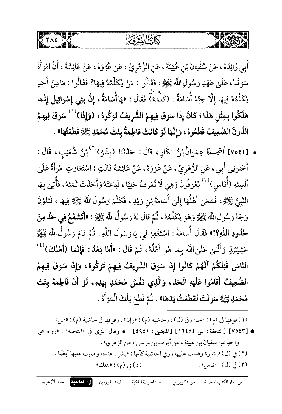 7544- أَخبَرنا عِمْرَانُ بنُ بَكَّارٍ، قَالَ: حَدَّثنا بِشْرُ بنُ شُعَيْبٍ، قَالَ: أَخْبَرَنِي أَبي، عَنِ الزُّهْرِيِّ، عَن عُرْوَةَ، عَن عَائِشَةَ، قَالَتْ: اسْتَعَارَتِ امْرَأَةٌ عَلَى أَلْسِنَةِ أُنَاسٍ يُعْرَفُونَ، وَهِيَ لا تُعْرَفُ حُلِيًّا فَبَاعَتْهُ، وَأَخَذَتْ ثَمَنَهُ، فَأُتِيَ بِهَا النَّبيُّ صَلى الله عَلَيهِ وسَلم، فَسَعَى أَهْلُهَا إِلَى أُسَامَةَ بنِ زَيْدٍ، فَكَلَّمَ رَسُولَ اللهِ صَلى الله عَلَيهِ وسَلم فِيهَا، فَتَلَوَّنَ وَجْهُ رَسُولِ اللهِ صَلى الله عَلَيهِ وسَلم وَهُوَ يُكَلِّمُهُ، ثُمَّ قَالَ لَهُ رَسُولُ اللهِ صَلى الله عَلَيهِ وسَلم: أَتَشْفَعُ فِي حَدٍّ مِنْ حُدُودِ اللهِ؟ فَقَالَ أُسَامَةُ: اسْتَغْفِرْ لِي يَا رَسُولَ اللهِ، ثُمَّ قَامَ رَسُولُ اللهِ صَلى الله عَلَيهِ وسَلم عَشِيَّةَ إِذٍ وَأَثْنَى عَلَى اللهِ بِمَا هُوَ أَهْلُهُ، ثُمَّ قَالَ: أَمَّا بَعْدُ، فَإِنَّمَا أَهْلَكَ النَّاسَ قَبْلَكُمْ أَنَّهُمْ كَانُوا إِذَا سَرَقَ الشَّرِيفُ فِيهِمْ تَرَكُوهُ، وَإِذَا سَرَقَ فِيهِمُ الضَّعِيفُ أَقَامُوا عَلَيْهِ الحَدَّ، وَالَّذِي نَفْسُ مُحَمدٍ بِيَدِهِ لَوْ أَنَّ فَاطِمَةَ بِنْتَ مُحَمدٍ صَلى الله عَلَيهِ وسَلم سَرَقَتْ لَقَطَعْتُ يَدَهَا، ثُمَّ قَطَعَ تِلْكَ المَرْأَةَ.