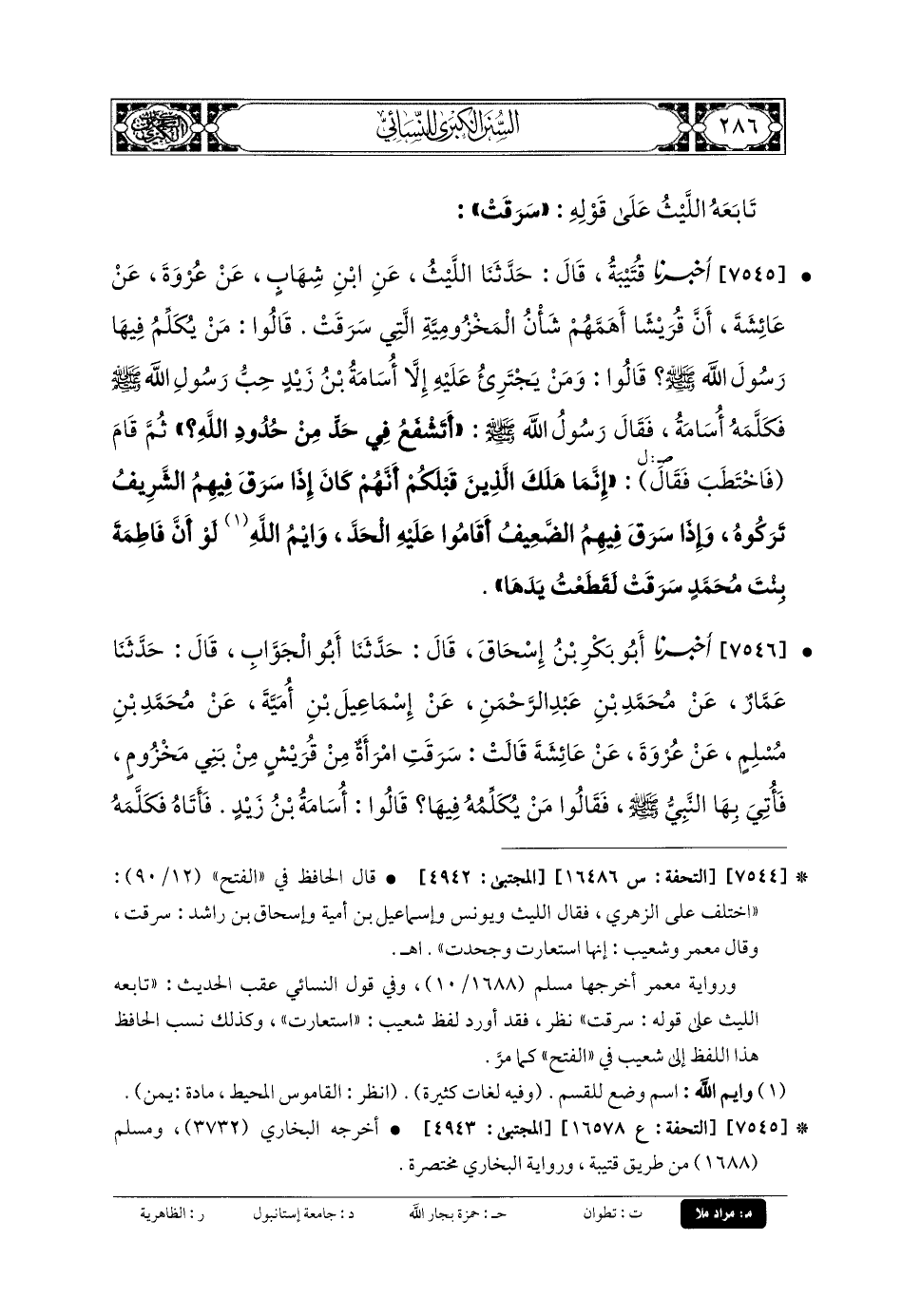 7545- أَخبَرنا قُتَيبَةُ، قَالَ: حَدَّثنا اللَّيْثُ، عَنِ ابْنِ شِهَابٍ، عَن عُرْوَةَ، عَن عَائِشَةَ، أَنَّ قُرَيْشًا أَهَمَّهُمْ شَأْنُ المَخْزُومِيَّةِ الَّتِي سَرَقَتْ، قَالُوا: مَنْ يُكَلِّمُ فِيهَا رَسُولَ اللهِ صَلى الله عَلَيهِ وسَلم؟ قَالُوا: وَمَنْ يَجْتَرِئُ عَلَيْهِ إِلاَّ أُسَامَةُ بنُ زَيْدٍ حِبُّ رَسُولِ اللهِ صَلى الله عَلَيهِ وسَلم؟ فَكَلَّمَهُ أُسَامَةُ، فَقَالَ رَسُولُ اللهِ صَلى الله عَلَيهِ وسَلم: أَتَشْفَعُ فِي حَدٍّ مِنْ حُدُودِ اللهِ؟ ثُمَّ قَامَ فَاخْتَطَبَ، فَقَالَ: إِنَّمَا هَلَكَ الَّذِينَ قَبْلَكُمْ أَنَّهُمْ كَانُوا إِذَا سَرَقَ فِيهِمُ الشَّرِيفُ تَرَكُوهُ، وَإِذَا سَرَقَ فِيهِمُ الضَّعِيفُ أَقَامُوا عَلَيْهِ الحَدَّ، وَايْمُ اللهِ لَوْ أَنَّ فَاطِمَةَ بِنْتَ مُحَمدٍ سَرَقَتْ، لَقَطَعْتُ يَدَهَا.