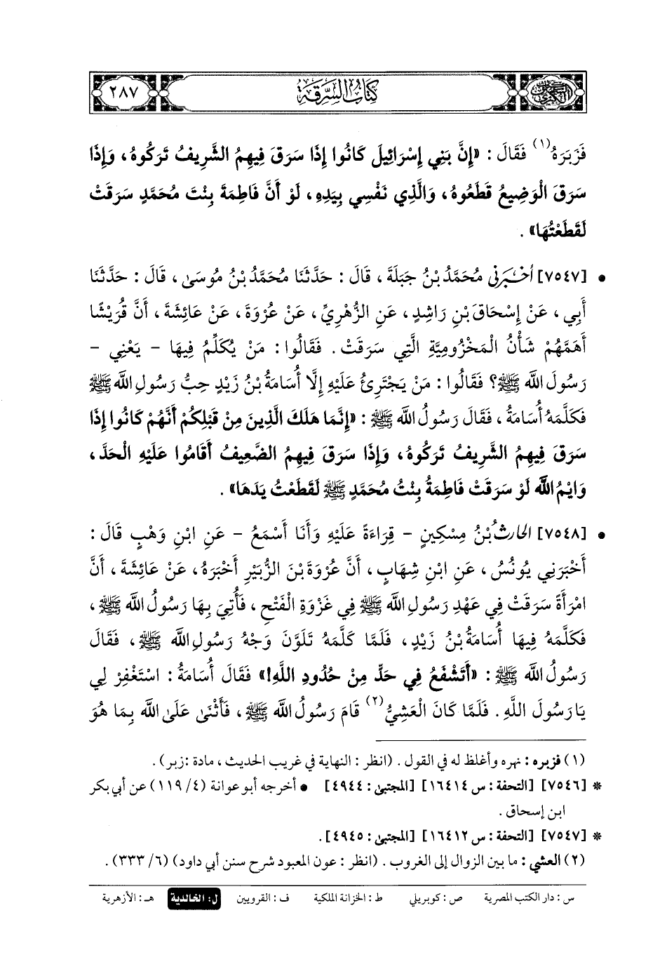 7547- أَخْبَرَنِي مُحَمدُ بنُ جَبَلَةَ، قَالَ: حَدَّثنا مُحَمدُ بنُ مُوسَى، قَالَ: حَدَّثنا أَبي، عَن إِسحَاقَ بنِ رَاشِدٍ، عَنِ الزُّهْرِيِّ، عَن عُرْوَةَ، عَن عَائِشَةَ، أَنَّ قُرَيْشًا أَهَمَّهُمْ شَأْنُ المَخْزُومِيَّةِ الَّتِي سَرَقَتْ، فَقَالُوا: مَنْ يُكَلِّمُ فِيهَا؟ يَعْنِي رَسُولَ اللهِ صَلى الله عَلَيهِ وسَلم، فَقَالُوا: مِنْ يَجْتَرِئُ عَلَيْهِ إِلاَّ أُسَامَةُ بنُ زَيْدٍ حِبُّ رَسُولِ اللهِ صَلى الله عَلَيهِ وسَلم؟ فَكَلَّمَهُ أُسَامَةُ، فَقَالَ رَسُولُ اللهِ صَلى الله عَلَيهِ وسَلم: إِنَّمَا هَلَكَ الَّذِينَ مِنْ قَبْلِكُمْ أَنَّهُمْ كَانُوا إِذَا سَرَقَ فِيهِمُ الشَّرِيفُ تَرَكُوهُ، وَإِذَا سَرَقَ فِيهِمُ الضَّعِيفُ أَقَامُوا عَلَيْهِ الحَدَّ، وَايْمُ اللهِ لَوْ سَرَقَتْ فَاطِمَةُ بِنْتُ مُحَمدٍ صَلى الله عَلَيهِ وسَلم، لَقَطَعْتُ يَدَهَا.