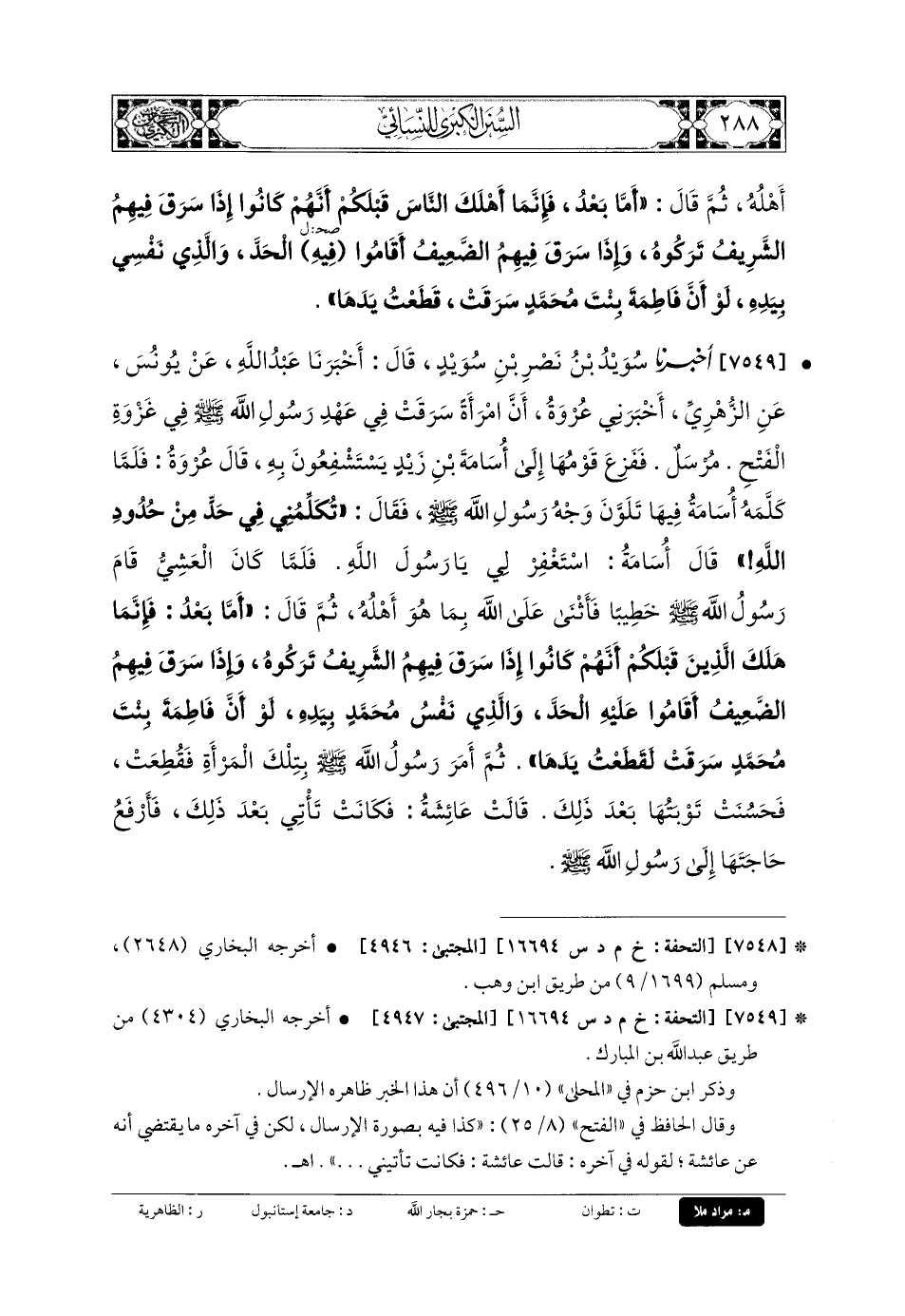 7549- أَخبَرنا سُوَيْدُ بنُ نَصْرِ بنِ سُوَيْدٍ، قال: أَخبَرنا عَبدُ اللهِ، عَن يُونُسَ، عَنِ الزُّهْرِيِّ، أَخْبَرَنِي عُرْوَةُ، أَنَّ امْرَأَةً سَرَقَتْ فِي عَهْدِ رَسُولِ اللهِ صَلى الله عَلَيهِ وسَلم فِي غَزْوَةِ الفَتْحِ، مُرْسَلٌ، فَفَزِعَ قَوْمُهَا إِلَى أُسَامَةَ بنِ زَيْدٍ، يَسْتَشْفِعُونَ بِهِ، قَالَ عُرْوَةُ: فَلَمَّا كَلَّمَهُ أُسَامَةُ فِيهَا، تَلَوَّنَ وَجْهُ رَسُولِ اللهِ صَلى الله عَلَيهِ وسَلم، فَقَالَ: تُكَلِّمُنِي فِي حَدٍّ مِنْ حُدُودِ اللهِ؟ قَالَ أُسَامَةُ: اسْتَغْفِرْ لِي يَا رَسُولَ اللهِ، فَلَمَّا كَانَ العَشِيُّ، قَامَ رَسُولُ اللهِ صَلى الله عَلَيهِ وسَلم خَطِيبًا، فَأَثْنَى عَلَى اللهِ بِمَا هُوَ أَهْلُهُ، ثُمَّ قَالَ: أَمَّا بَعْدُ فَإِنَّمَا هَلَكَ الَّذِينَ قَبْلَكُمْ أَنَّهُمْ كَانُوا إِذَا سَرَقَ فِيهِمُ الشَّرِيفُ تَرَكُوهُ، وَإِذَا سَرَقَ فِيهِمُ الضَّعِيفُ أَقَامُوا عَلَيْهِ الحَدَّ، وَالَّذِي نَفْسُ مُحَمدٍ بِيَدِهِ، لَوْ أَنَّ فَاطِمَةَ بِنْتَ مُحَمدٍ سَرَقَتْ، لَقَطَعْتُ يَدَهَا، ثُمَّ أَمَرَ رَسُولُ اللهِ صَلى الله عَلَيهِ وسَلم بِتِلْكَ المَرْأَةِ، فَقُطِعَتْ فَحَسُنَتْ تَوْبَتُهَا بَعْدَ ذَلِكَ.
