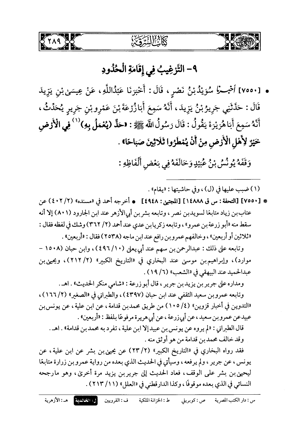 7550- أَخبَرنا سُوَيْدُ بنُ نَصْرٍ، قَالَ: أَخبَرنا عَبدُ اللهِ، عَن عِيسَى بنِ يَزِيدَ، قَالَ: حَدَّثني جَرِيرُ بنُ يَزِيدَ، أَنَّهُ سَمِعَ أَبَا زُرْعَةَ بْنَ عَمْرِو بنِ جَرِيرٍ يُحَدِّثُ, أَنَّهُ سَمِعَ أَبَا هُرَيْرَةَ يَقُولُ: قَالَ رَسُولُ اللهِ صَلى الله عَلَيهِ وسَلم: حَدٌّ يُعْمَلُ بِهِ فِي الأَرْضِ خَيْرٌ لأَهْلِ الأَرْضِ مِنْ أَنْ يُمْطَرُوا ثَلاثِينَ صَبَاحًا.