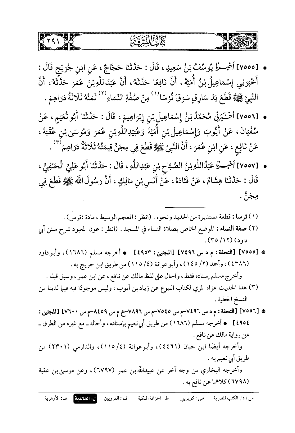 7555- أَخبَرنا يُوسُفُ بنُ سَعِيدٍ، قَالَ: حَدَّثنا حَجَّاجٌ، عَنِ ابْنِ جُرَيْجٍ، قَالَ: أَخْبَرَنِي إِسمَاعِيلُ بنُ أُمَيَّةَ، أَنَّ نَافِعًا حَدَّثَهُ، أَنَّ عَبدَ اللهِ بْنَ عُمَرَ حَدَّثَهُ، أَنَّ النَّبيَّ صَلى الله عَلَيهِ وسَلم قَطَعَ يَدَ سَارِقٍ سَرَقَ تُرْسًا مِنْ صُفَّةِ النِّسَاءِ، ثَمَنُهُ ثَلاثَةُ دَرَاهِمَ.