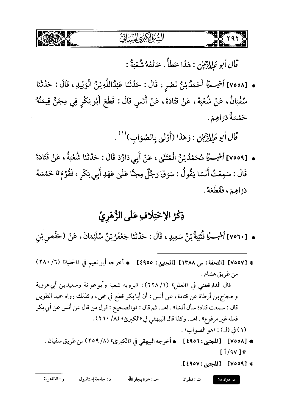7558- أَخبَرنا أَحْمَدُ بنُ نَصْرٍ، قَالَ: حَدَّثنا عَبدُ اللهِ بنُ الوَلِيدِ، قَالَ: حَدَّثنا سُفيانُ، عَن شُعْبَةَ، عَن قَتَادَةَ، عَن أَنَسٍ، قَالَ: قَطَعَ أَبو بَكْرٍ فِي مِجَنٍّ قِيمَتُهُ خَمْسَةُ دَرَاهِمَ.