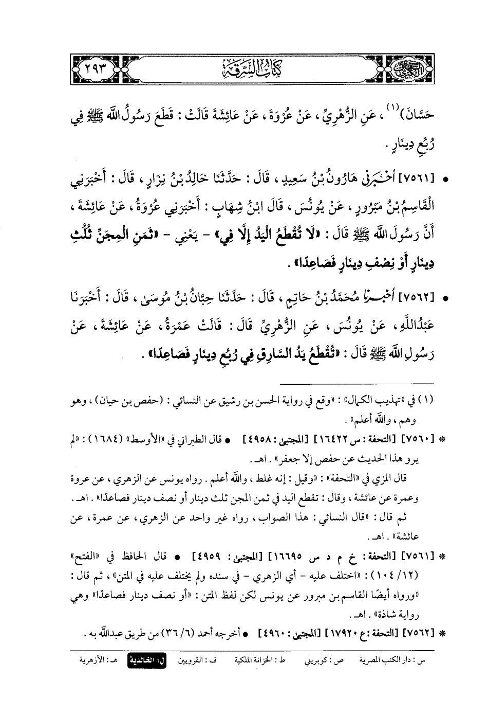 7561- أَخبَرني هَارُونُ بنُ سَعِيدٍ، قَالَ: حَدَّثنا خَالِدُ بنُ نِزَارٍ، قَالَ: أَخْبَرَنِي القَاسِمُ بنُ مَبْرُورٍ، عَن يُونُسَ، قَالَ ابْنُ شِهَابٍ (1): أَخْبَرَنِي عُرْوَةُ، عَن عَائِشَةَ، أَنَّ رَسُولَ اللهِ صَلى الله عَلَيهِ وسَلم قَالَ: لا تُقْطَعُ اليَدُ إِلاَّ فِي، يَعْنِي، ثَمَنِ المِجَنِّ ثُلُثَ دِينَارٍ, أَوْ نِصْفِ دِينَارٍ فَصَاعِدًا.