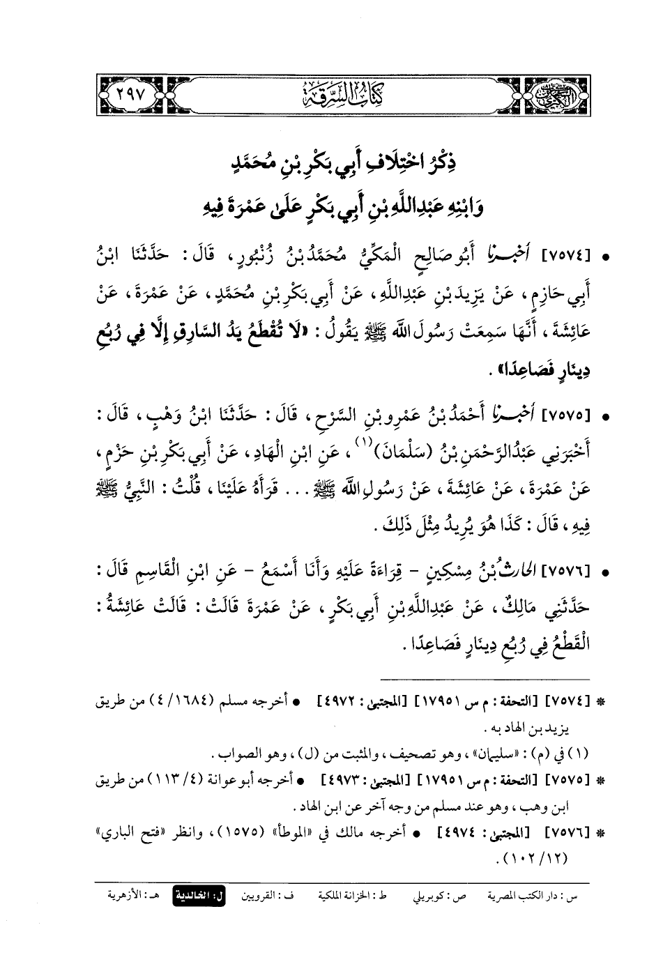 7576- الحَارِثُ بنُ مِسْكِينٍ، قِرَاءَةً عَلَيْهِ، وَأنا أَسْمَعُ، عَنِ ابْنِ القَاسِمِ، قَالَ: حَدَّثني مَالِكٌ، عَن عَبدِ اللهِ بنِ أَبي بَكْرٍ، عَن عَمْرَةَ قَالَتْ: قَالَتْ عَائِشَةُ: القَطْعُ فِي رُبْعِ دِينَارٍ فَصَاعِدًا.