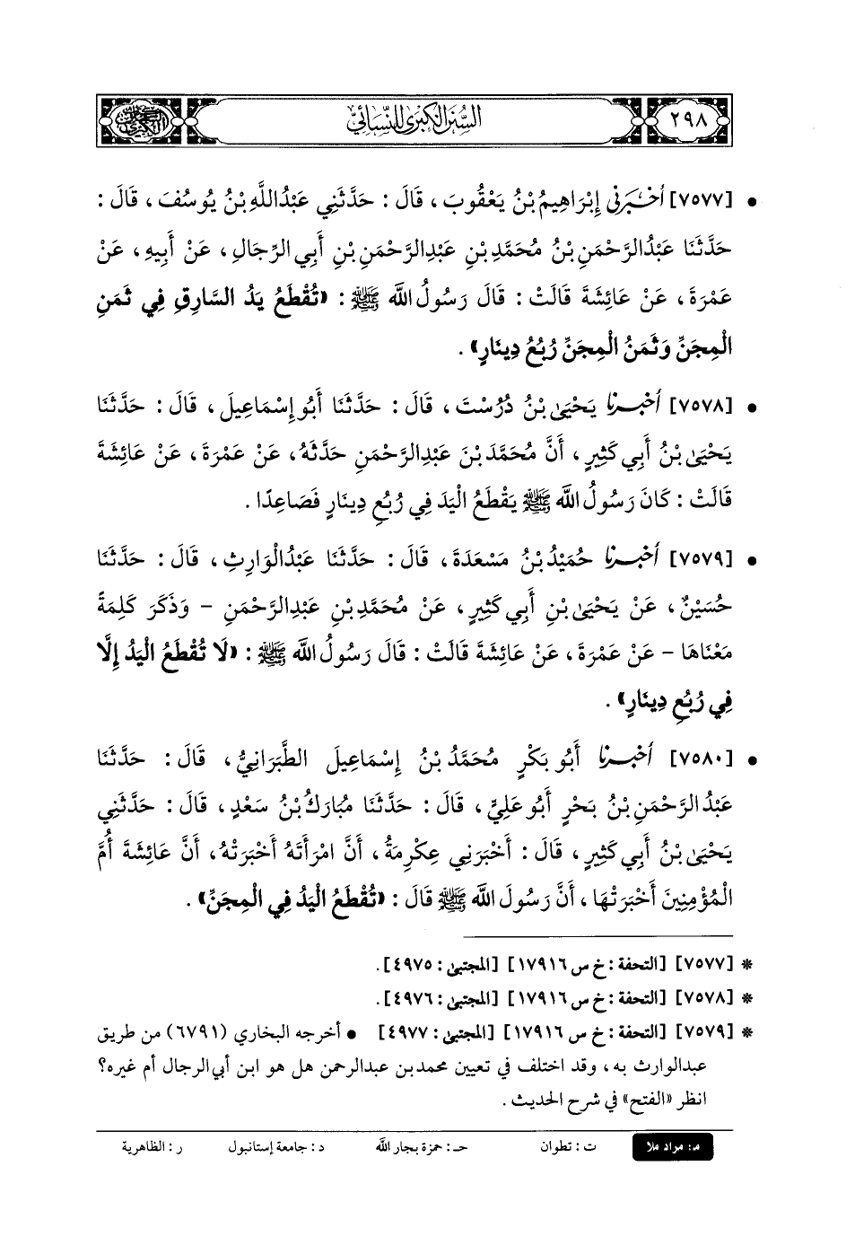 7579- أَخبَرنا حُمَيْدُ بنُ مَسْعَدَةَ، قَالَ: حَدَّثنا عَبدُ الوَارِثِ، قَالَ: حَدَّثنا حُسَيْنٌ، عَن يَحْيَى بنِ أَبي كَثِيرٍ، عَن مُحَمدِ بنِ عَبدِ الرَّحمَنِ، وَذَكَرَ كَلِمَةً مَعْنَاهَا، عَن عَمْرَةَ، عَن عَائِشَةَ، قَالَتْ: قَالَ رَسُولُ اللهِ صَلى الله عَلَيهِ وسَلم: لا تُقْطَعُ اليَدُ إِلاَّ فِي رُبْعِ دِينَارٍ.