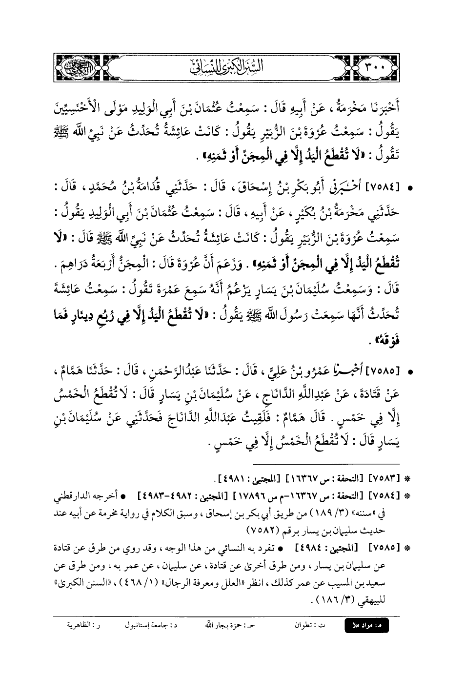 7585- أَخبَرنا عَمْرُو بنُ عَليٍّ، قَالَ: حَدَّثنا عَبدُ الرَّحمَنِ، قَالَ: حَدَّثنا هَمَّامٌ، عَن قَتَادَةَ، عَن عَبدِ اللهِ الدَّانَاجِ، عَن سُلَيْمَانَ بنِ يَسَارٍ، قَالَ: لا تُقْطَعُ الخَمْسُ إِلاَّ فِي خَمْسٍ.