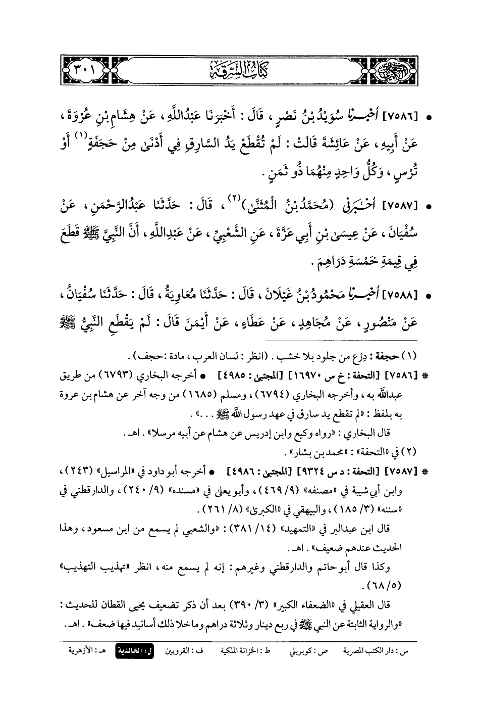 7586- أَخبَرنا سُوَيْدُ بنُ نَصْرٍ، قَالَ: أَخبَرنا عَبدُ اللهِ، عَن هِشَامِ بنِ عُرْوَةَ، عَن أَبيهِ، عَن عَائِشَةَ، قَالَتْ: لَمْ تُقْطَعْ يَدُ السَّارِقِ فِي أَدْنَى مِنْ حَجَفَةٍ, أَوْ تُرْسٍ، وَكُلُّ وَاحِدٍ مِنْهُمَا ذُو ثَمَنٍ.