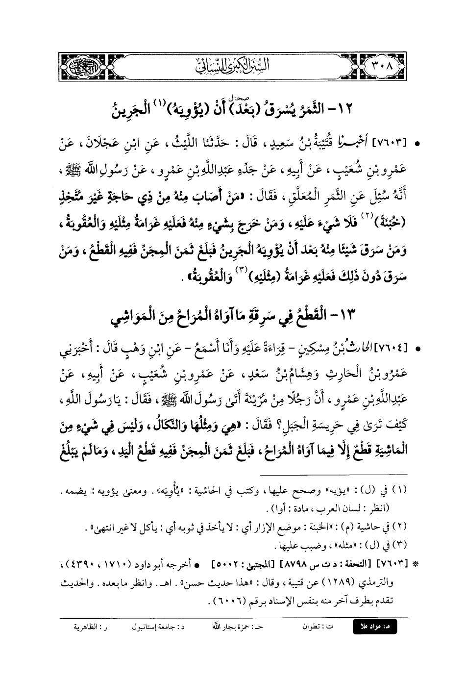 7604- الحَارِثُ بنُ مِسْكِينٍ، قِرَاءَةً عَلَيْهِ، وَأنا أَسْمَعُ، عَنِ ابْنِ وَهْبٍ، قَالَ: أَخْبَرَنِي عَمْرُو بنُ الحَارِثِ، وَهِشَامُ بنُ سَعْدٍ، عَن عَمْرِو بنِ شُعَيْبٍ، عَن أَبيهِ، عَن عَبدِ اللهِ بنِ عَمْرٍو، أَنَّ رَجُلاً مِنْ مُزَيْنَةَ أَتَى رَسُولَ اللهِ صَلى الله عَلَيهِ وسَلم، فَقَالَ: يَا رَسُولَ اللهِ، كَيْفَ تَرَى فِي حَرِيسَةِ الجَبَلِ؟ فَقَالَ: هِيَ وَمِثْلُهَا وَالنَّكَالُ، وَلَيْسَ فِي شَيْءٍ مِنَ المَاشِيَةِ قَطْعٌ، إِلاَّ فِيمَا آوَاهُ المُرَاحُ، فَبَلَغَ ثَمَنَ المِجَنِّ، فَفِيهِ قَطْعُ اليَدِ، وَمَا لَمْ يَبْلُغْ ثَمَنَ المِجَنِّ، فَفِيهِ غَرَامَةُ مِثْلَيْهِ وَجَلَدَاتُ نَكَالٍ، قَالَ: يَا رَسُولَ اللهِ، كَيْفَ تَرَى فِي الثَّمَرِ المُعَلَّقِ؟ قَالَ: هُوَ وَمِثْلُهُ مَعَهَ وَالنَّكَالُ، وَلَيْسَ فِي شَيْءٍ مِنَ الثَّمَرِ المُعَلَّقِ قَطْعٌ، إِلاَّ فِيمَا آوَاهُ الجَرِينُ، فَمَا أُخِذَ مِنَ الجَرِينِ فَبَلَغَ ثَمَنَ المِجَنِّ فَفِيهِ القَطْعُ، وَمَا لَمْ يَبْلُغْ ثَمَنَ المِجَنِّ، فَفِيهِ غَرَامَةُ مِثْلَيْهِ وَجَلَدَاتُ نَكَالٍ.