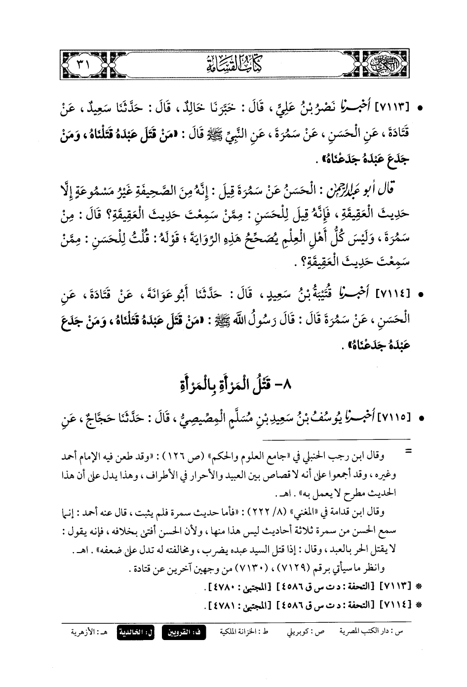 7114- أَخبَرنا قُتَيبَةُ بنُ سَعِيدٍ، قَالَ: حَدثنا أَبو عَوَانَةَ، عَن قَتَادَةَ، عَنِ الحَسَنِ، عَن سَمُرَةَ، قَالَ: قَالَ رَسُولُ اللهِ صَلى الله عَلَيهِ وسَلم: مَنْ قَتَلَ عَبدَهُ قَتَلْنَاهُ، وَمَنْ جَدَعَ عَبدَهُ جَدَعْنَاهُ.