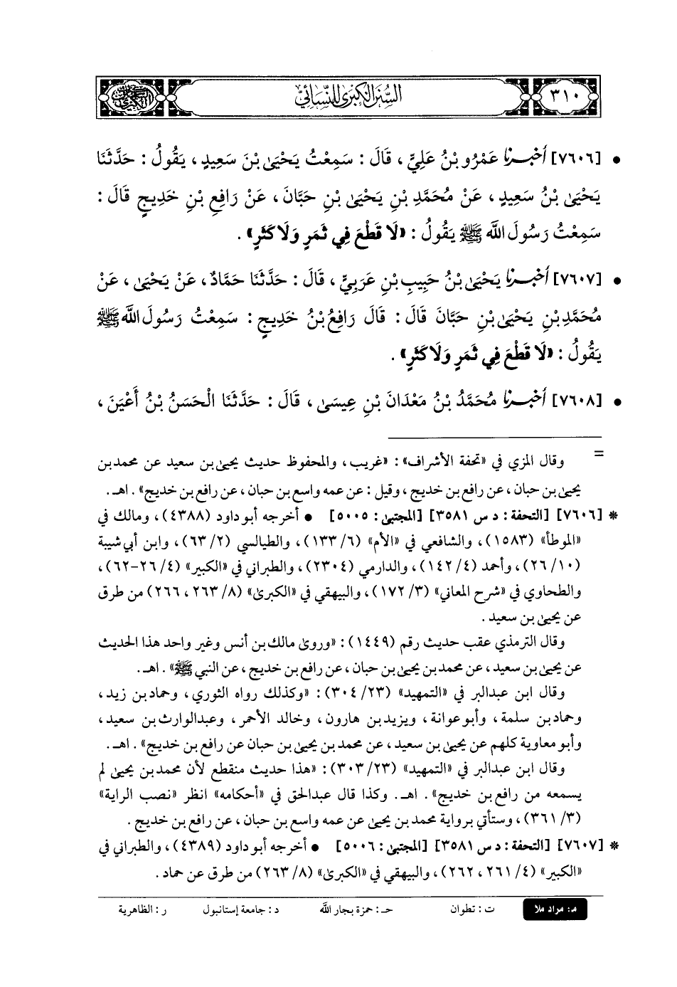 7608- أَخبَرنا مُحَمدُ بنُ مَعْدَانَ بنِ عِيسَى، قَالَ: حَدَّثنا الحَسَنُ بنُ أَعْيَنَ، قَالَ: حَدَّثنا زُهَيْرٌ، قَالَ: حَدَّثنا يَحْيَى، عَن مُحَمدِ بنِ يَحْيَى بنِ حَبَّانَ، عَن رَافِعُ بنُ خَدِيجٍ، قَالَ: قَالَ رَسُولُ اللهِ صَلى الله عَلَيهِ وسَلم: لا قَطْعَ فِي ثَمَرٍ وَلا كَثَرٍ.