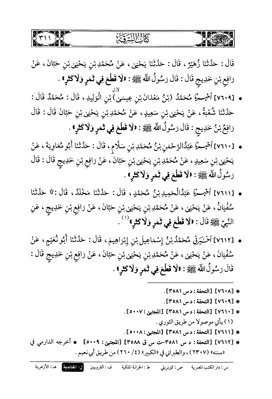 7612- أَخبَرنِي مُحَمدُ بنُ إِسمَاعِيلَ بنِ إِبْرَاهِيمَ، قَالَ: حَدَّثنا أَبو نُعَيْمٍ، عَن سُفيانَ، عَن يَحْيَى، عَن مُحَمدِ بنِ يَحْيَى بنِ حَبَّانَ، عَن رَافِعِ بنِ خَدِيجٍ قَالَ: قَالَ رَسُولُ اللهِ صَلى الله عَلَيهِ وسَلم: لا قَطْعَ فِي ثَمَرٍ وَلا كَثَرٍ.