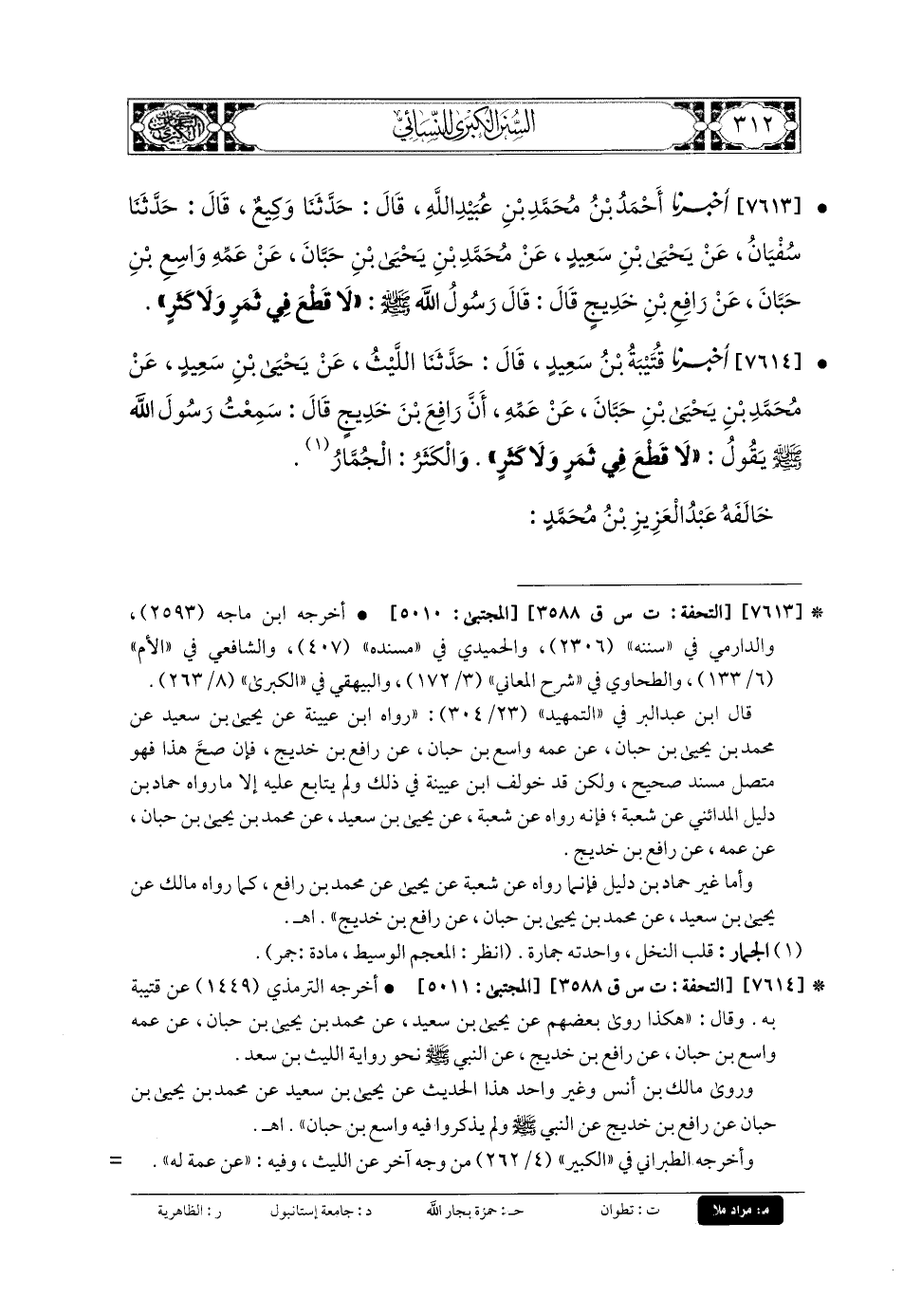 7613- أَخبَرنا أَحْمَدُ بنُ مُحَمدِ بنِ عُبَيْدِ اللهِ، قَالَ: حَدَّثنا وَكِيعٌ، قَالَ: حَدَّثنا سُفيانُ، عَن يَحْيَى بنِ سَعِيدٍ، عَن مُحَمدِ بنِ يَحْيَى بنِ حَبَّانَ، عَن عَمِّهِ وَاسِعِ بنِ حَبَّانَ، عَن رَافِعِ بنِ خَدِيجٍ، قَالَ: قَالَ رَسُولُ اللهِ صَلى الله عَلَيهِ وسَلم: لا قَطْعَ فِي ثَمَرٍ وَلا كَثَرٍ.