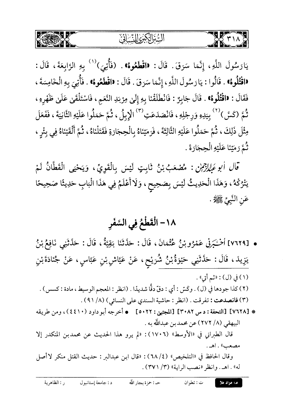 7629- أَخْبَرَنِي عَمْرُو بنُ عُثْمَانَ، قَالَ: حَدَّثنا بَقِيَّةُ، قَالَ: حَدَّثني نَافِعُ بنُ يَزِيدَ، قَالَ: حَدَّثني حَيْوَةُ بنُ شُرَيْحٍ، عَن عَيَّاشِ بنِ عَبَّاسٍ، عَن جُنَادَةَ بنِ أَبي أُمَيَّةَ، قَالَ: سَمِعْتُ بُسْرَ بْنَ أَبي أَرْطَاةَ قَالَ: سَمِعْتُ رَسُولَ اللهِ صَلى الله عَلَيهِ وسَلم يَقُولُ: لا تُقْطَعُ الأَيْدِي فِي السَّفَرِ.