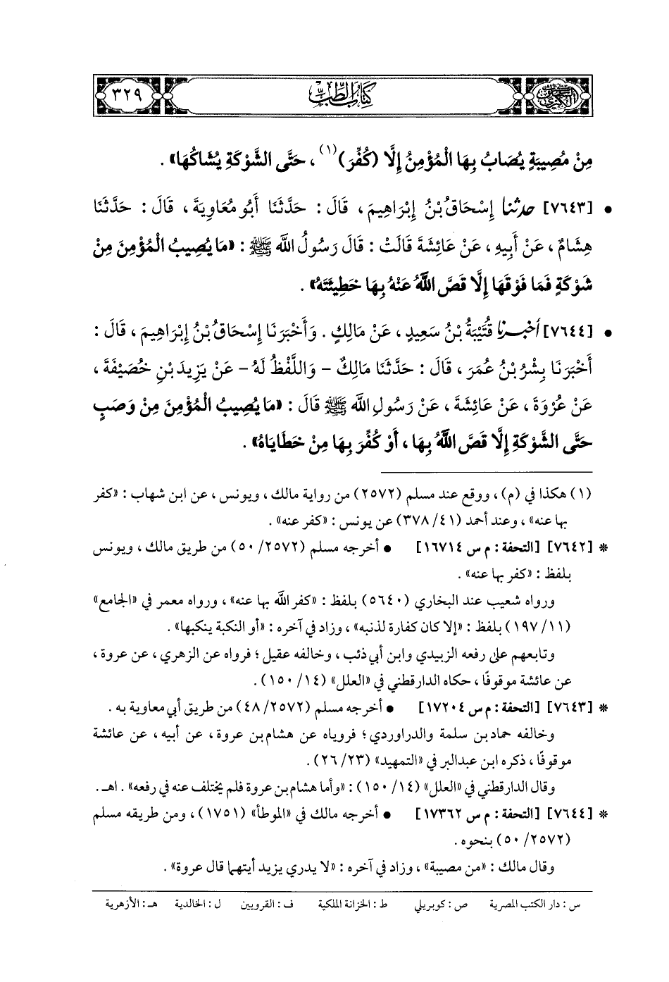 7644- أَخبَرنا قُتَيبَةُ بنُ سَعِيدٍ، عَن مَالِكٍ (ح) وَأَخبَرنا إِسحَاقُ بنُ إِبْرَاهِيمَ، قَالَ: أَخبَرنا بِشْرُ بنُ عُمَرَ، قَالَ: حَدَّثنا مَالِكٌ، وَاللَّفْظُ لَهُ، عَن يَزِيدَ بنِ خُصَيْفَةَ، عَن عُرْوَةَ، عَن عَائِشَةَ، عَن رَسُولِ اللهِ صَلى الله عَلَيهِ وسَلم قَالَ: مَا يُصِيبُ المُؤْمِنَ مِنْ وَصَبٍ، حَتَّى الشَّوْكَةِ، إِلاَّ قَصَّ اللهُ بِهَا, أَوْ كُفِّرَ بِهَا مِنْ خَطَايَاهُ.