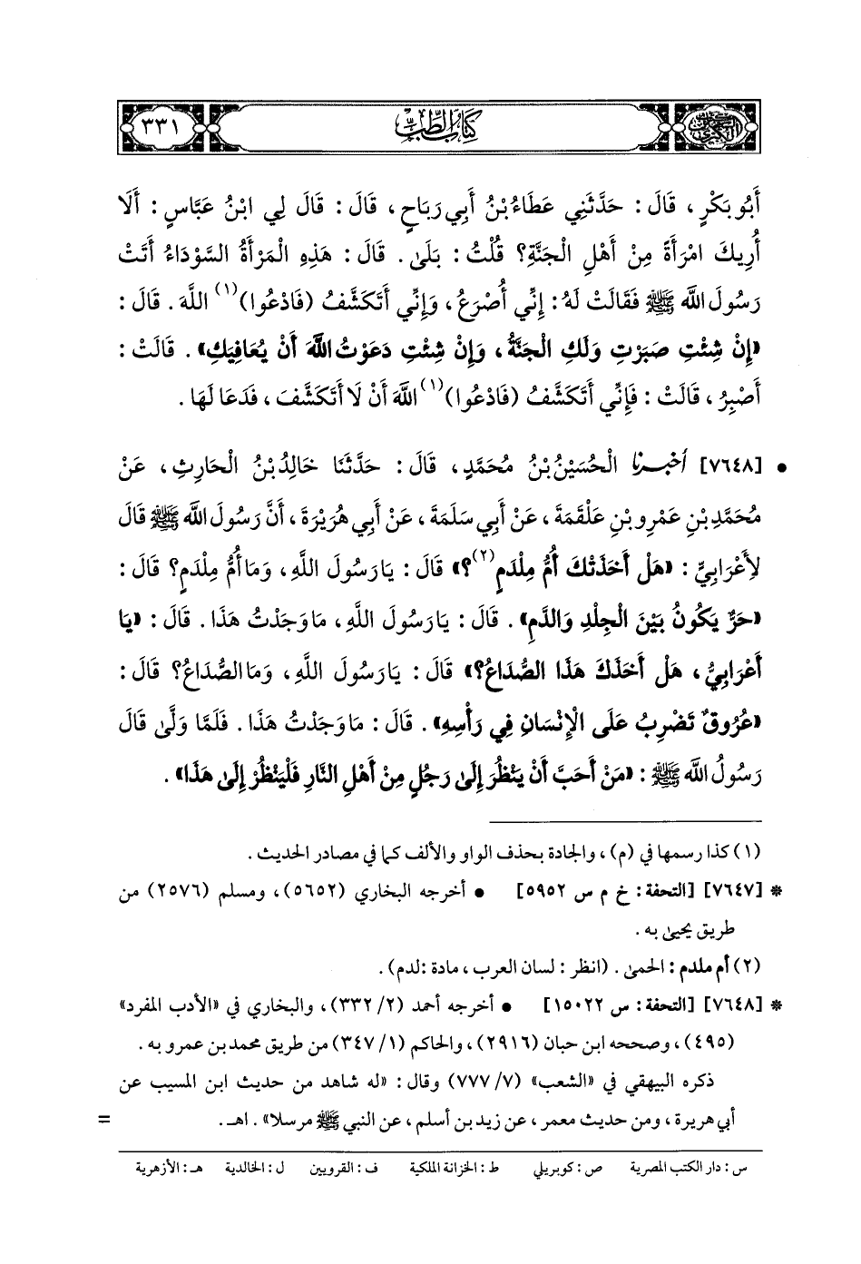 7648- أَخبَرنا الحُسَيْنُ بنُ مُحَمدٍ، قَالَ: حَدَّثنا خَالِدُ بنُ الحَارِثِ، عَن مُحَمدِ بنِ عَمْرِو بنِ عَلْقَمَةَ، عَن أَبي سَلَمَةَ، عَن أَبي هُرَيْرَةَ، أَنَّ رَسُولَ اللهِ صَلى الله عَلَيهِ وسَلم قَالَ لأَعْرَابِيٍّ: هَلْ أَخَذَتْكَ أُمُّ مِلْدَمٍ؟ قَالَ: يَا رَسُولَ اللهِ، وَمَا أُمُّ مِلْدَمٍ؟ قَالَ: حَرٌّ يَكُونُ بَيْنَ الجِلْدِ وَالدَّمِ، قَالَ: يَا رَسُولَ اللهِ، مَا وَجَدْتُ هَذَا، قَالَ: يَا أَعْرَابِيُّ، هَلْ أَخْذَكَ هَذَا الصُّدَاعُ؟ قَالَ: يَا رَسُولَ اللهِ، وَمَا الصُّدَاعُ؟ قَالَ: عُرُوقٌ تَضْرِبُ عَلَى الإِنْسَانِ فِي رَأْسِهِ، قَالَ: مَا وَجَدْتُ هَذَا، فَلَمَّا وَلَّى، قَالَ رَسُولُ اللهِ صَلى الله عَلَيهِ وسَلم: مَنْ أَحَبَّ أَنْ يَنْظُرَ إِلَى رَجُلٍ مِنْ أَهْلِ النَّارِ، فَلْيَنْظُرْ إِلَى هَذَا.