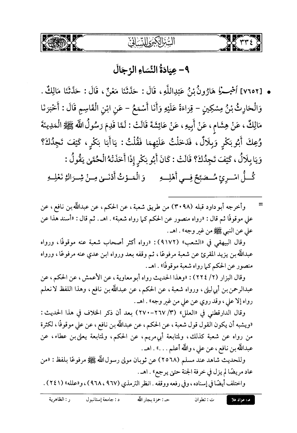 7652- أَخبَرنا هَارُونُ بنُ عَبدِ اللهِ، قَالَ: حَدَّثنا مَعْنٌ، قَالَ: حَدَّثنا مَالِكٌ. وَالحَارِثُ بنُ مِسْكِينٍ، قِرَاءَةً عَلَيْهِ، وَأنا أَسْمَعُ، عَنِ ابْنِ القَاسِمِ، قَالَ: أَخبَرنا مَالِكٌ، عَن هِشَامٍ، عَن أَبيهِ، عَن عَائِشَةَ قَالَتْ: لَمَّا قَدِمَ رَسُولُ اللهِ صَلى الله عَلَيهِ وسَلم المَدِينَةَ، وُعِكَ أَبو بَكْرٍ، وَبِلالٌ، فَدَخَلْتُ عَلَيْهِمَا، فَقُلْتُ: يَا أَبَا بَكْرٍ، كَيْفَ تَجِدُكَ؟ وَيَا بِلالُ, كَيْفَ تَجِدُكَ؟ قَالَتْ: كَانَ أَبو بَكْرٍ إِذَا أَخَذَتْهُ الحُمَّى يَقُولُ: