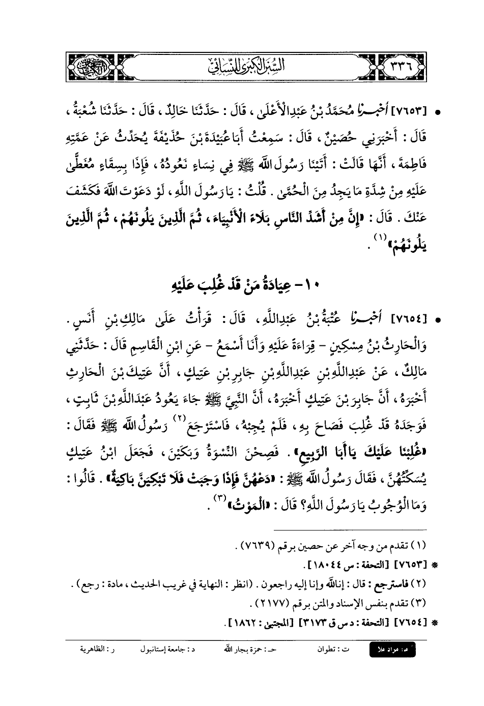 7653- أَخبَرنا مُحَمدُ بنُ عَبدِ الأَعْلَى، قَالَ: حَدَّثنا خَالِدٌ، قَالَ: حَدَّثنا شُعْبَةُ، قَالَ: أَخْبَرَنِي حُصَيْنٌ، قَالَ: سَمِعْتُ أَبَا عُبَيْدَةَ بْنَ حُذَيْفَةَ يُحَدِّثُ عَن عَمَّتِهِ فَاطِمَةَ أَنَّهَا قَالَتْ: أَتَيْنَا رَسُولَ اللهِ صَلى الله عَلَيهِ وسَلم فِي نِسَاءٍ نَعُودُهُ، فَإِذَا بِسِقَاءٍ مُغَطًّى عَلَيْهِ مِنْ شِدَّةِ مَا يَجِدُ مِنَ الحُمَّى، قُلْتُ: يَا رَسُولَ اللهِ، لَوْ دَعَوْتَ اللهَ فَكَشَفَ عَنكَ، قَالَ: إِنَّ مِنْ أَشَدِّ النَّاسِ بَلاءً الأَنْبِيَاءُ، ثُمَّ الَّذِينَ يَلُونَهُمْ، ثُمَّ الَّذِينَ يَلُونَهُمْ.