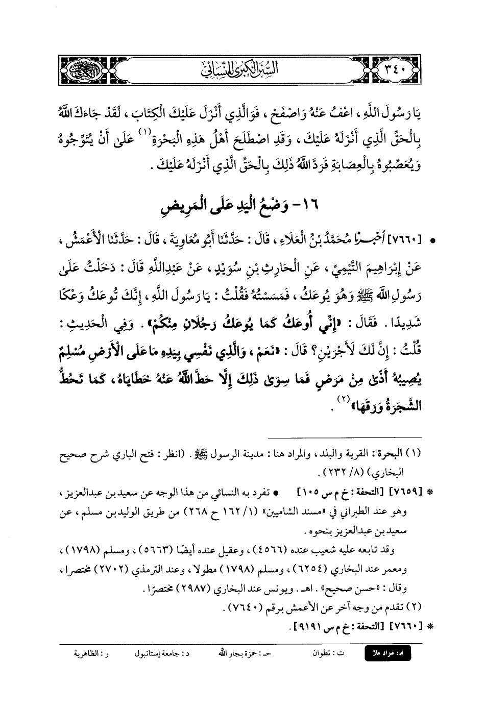 7660- أَخبَرنا مُحَمدُ بنُ العَلاءِ، قَالَ: حَدَّثنا أَبو مُعاويَةَ، قَالَ: حَدَّثنا الأَعْمَشُ، عَن إِبْرَاهِيمَ التَّيْمِيِّ، عَنِ الحَارِثِ بنِ سُوَيْدٍ، عَن عَبدِ اللهِ قَالَ: دَخَلْتُ عَلَى رَسُولِ اللهِ صَلى الله عَلَيهِ وسَلم وَهُوَ يُوعَكُ, فَمَسَسْتُهُ، فَقُلْتُ: يَا رَسُولَ اللهِ، إِنَّكَ تُوعَكُ وَعْكًا شَدِيدًا، فَقَالَ: إِنِّي أُوعَكُ كَمَا يُوعَكُ رَجُلانِ مِنْكُمْ، وَفِي الحَدِيثِ قُلْتُ: إِنَّ لَكَ لأَجْرَيْنِ؟ قَالَ: نَعَمْ، وَالَّذِي نَفْسِي بِيَدِهِ، مَا عَلَى الأَرْضِ مُسْلِمٌ يُصِيبُهُ أَذًى مِنْ مَرَضٍ فَمَا سِوَى ذَلِكَ إِلاَّ حَطَّ اللهُ عَنهُ خَطَايَاهُ، كَمَا تَحُطُّ الشَّجَرَةُ وَرَقَهَا.