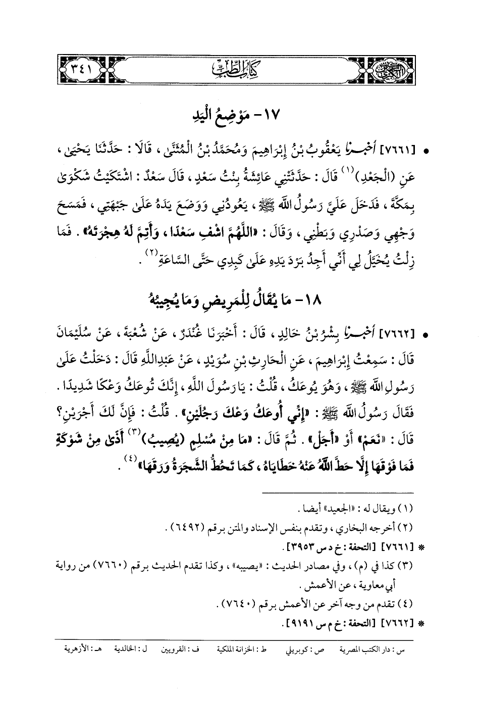 7661- أَخبَرنا يَعْقُوبُ بنُ إِبْرَاهِيمَ، وَمُحَمدُ بنُ المُثَنَّى، قَالا: حَدَّثنا يَحْيَى، عَنِ الجَعْدِ، قَالَ: حَدَّثَتْنِي عَائِشَةُ بِنْتُ سَعْدٍ، قَالَ سَعْدٌ: اشْتَكَيْتُ شَكْوَى بِمَكَّةَ، فَدَخَلَ عَلَيَّ رَسُولُ اللهِ صَلى الله عَلَيهِ وسَلم يَعُودُنِي، وَوَضَعَ يَدَهُ عَلَى جَبْهَتِي، فَمَسَحَ وَجْهِي وَصَدْرِي وَبَطْنِي، وَقَالَ: اللهُمَّ اشْفِ سَعْدًا, وَأَتَمَّ لَهُ هِجْرَتُهُ، فَمَا زِلْتُ يُخَيَّلُ لِي أَنِّي أَجِدُ بَرْدَ يَدِهِ عَلَى كَبِدِي حَتَّى السَّاعَةِ.